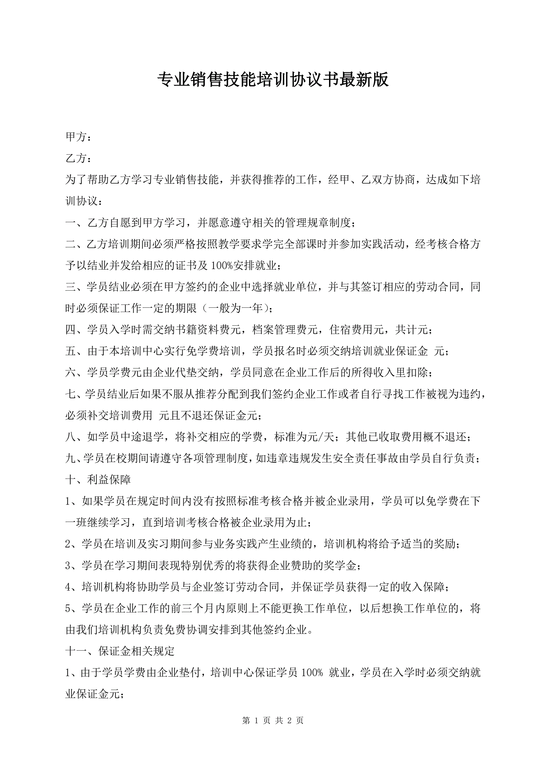 专业销售技能培训协议书最新版