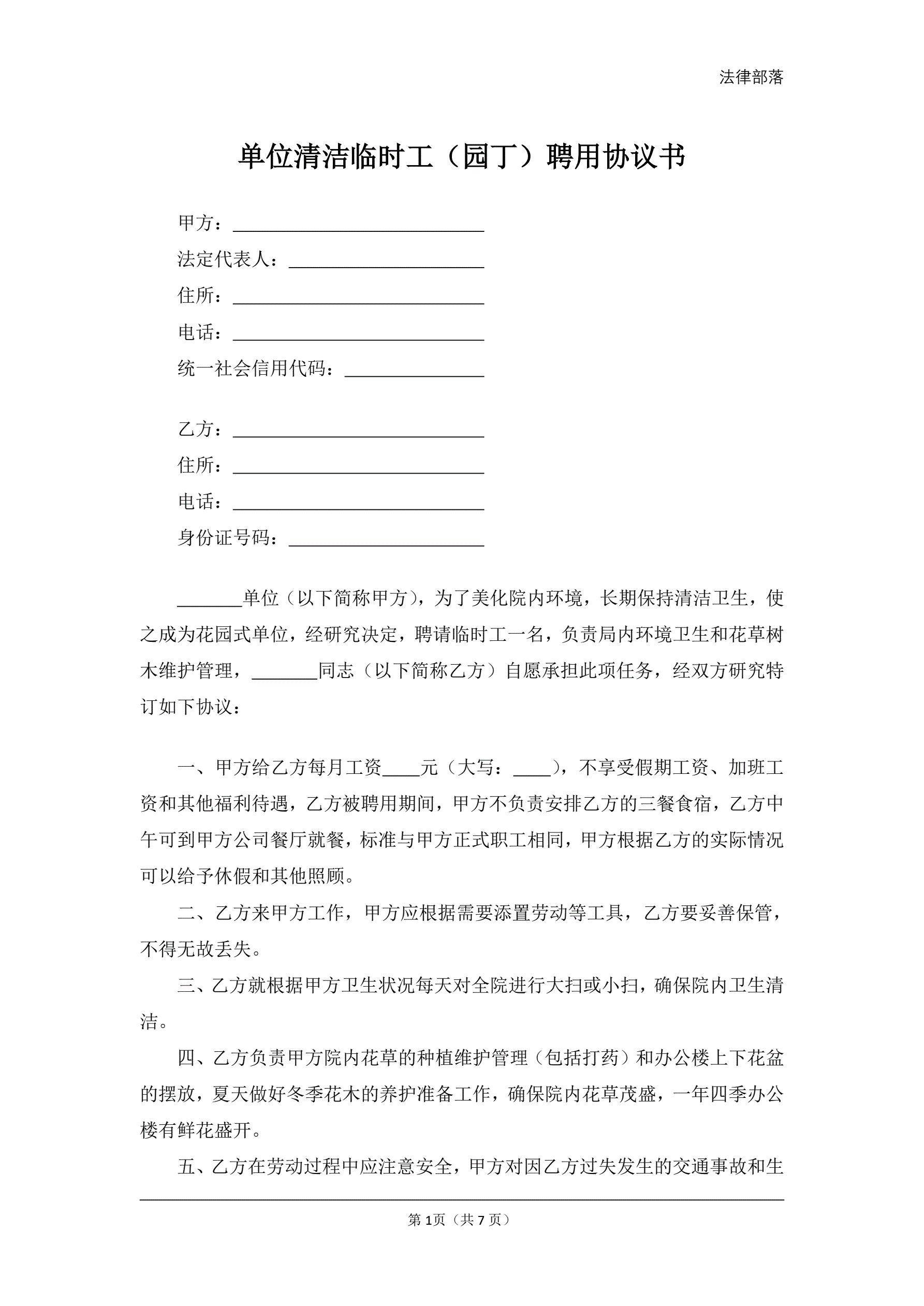 >单位清洁临时工(园丁)聘用协议书
