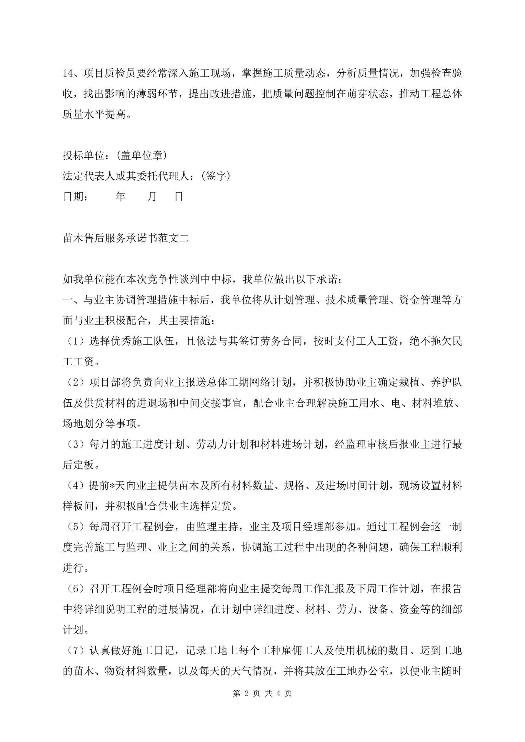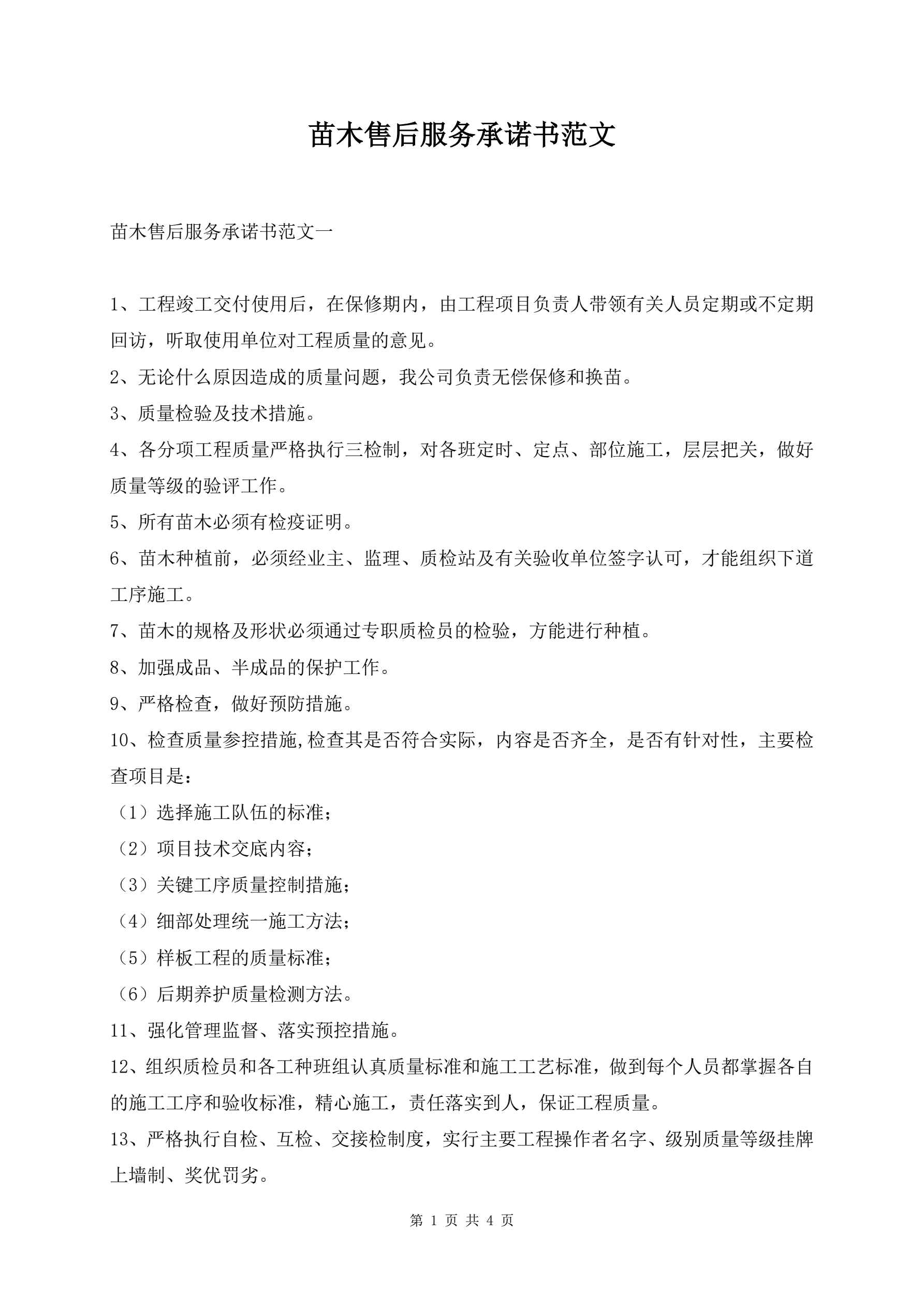 苗木售后服务承诺书范文