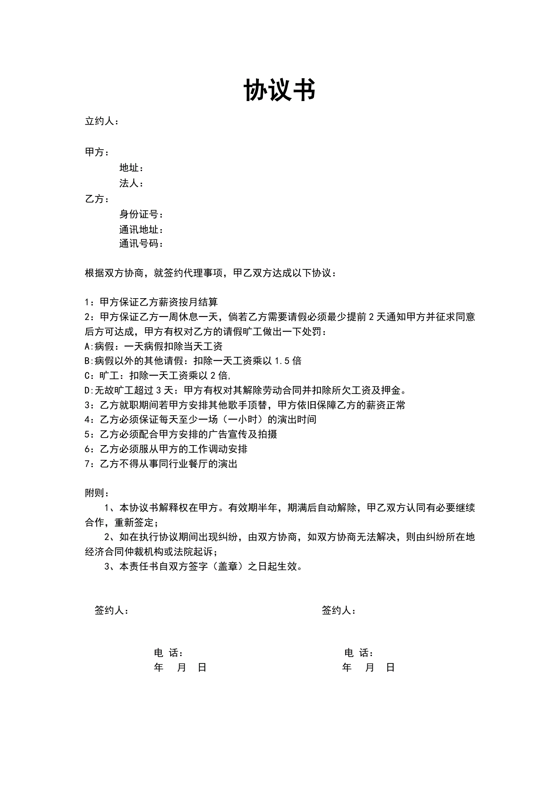 艺人签约协议书