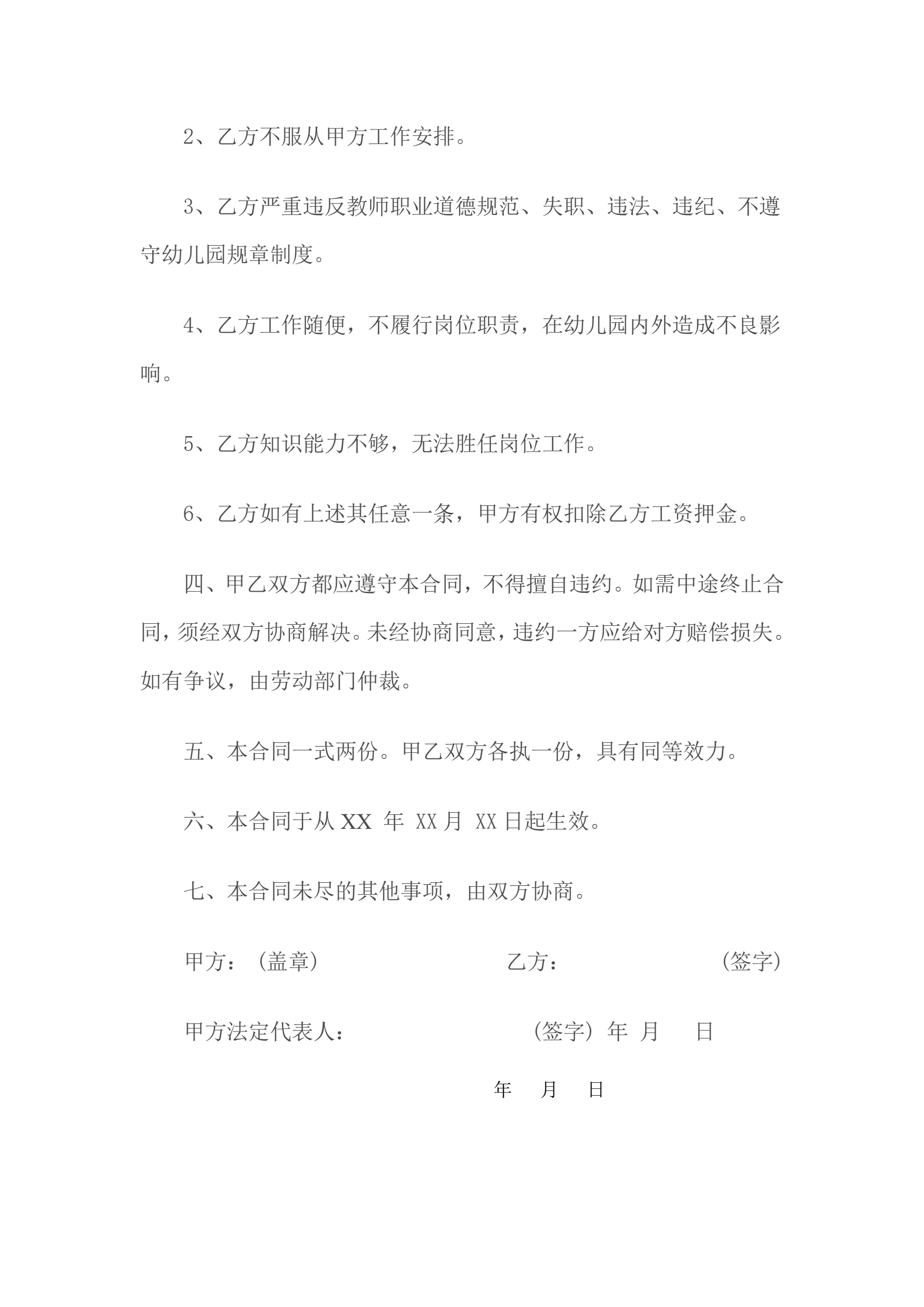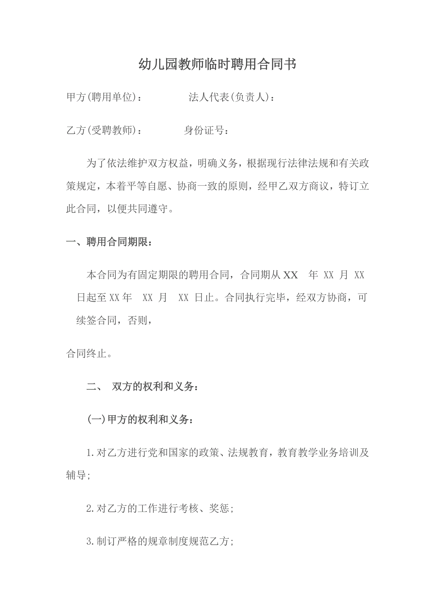 幼儿园教师临时聘用合同书