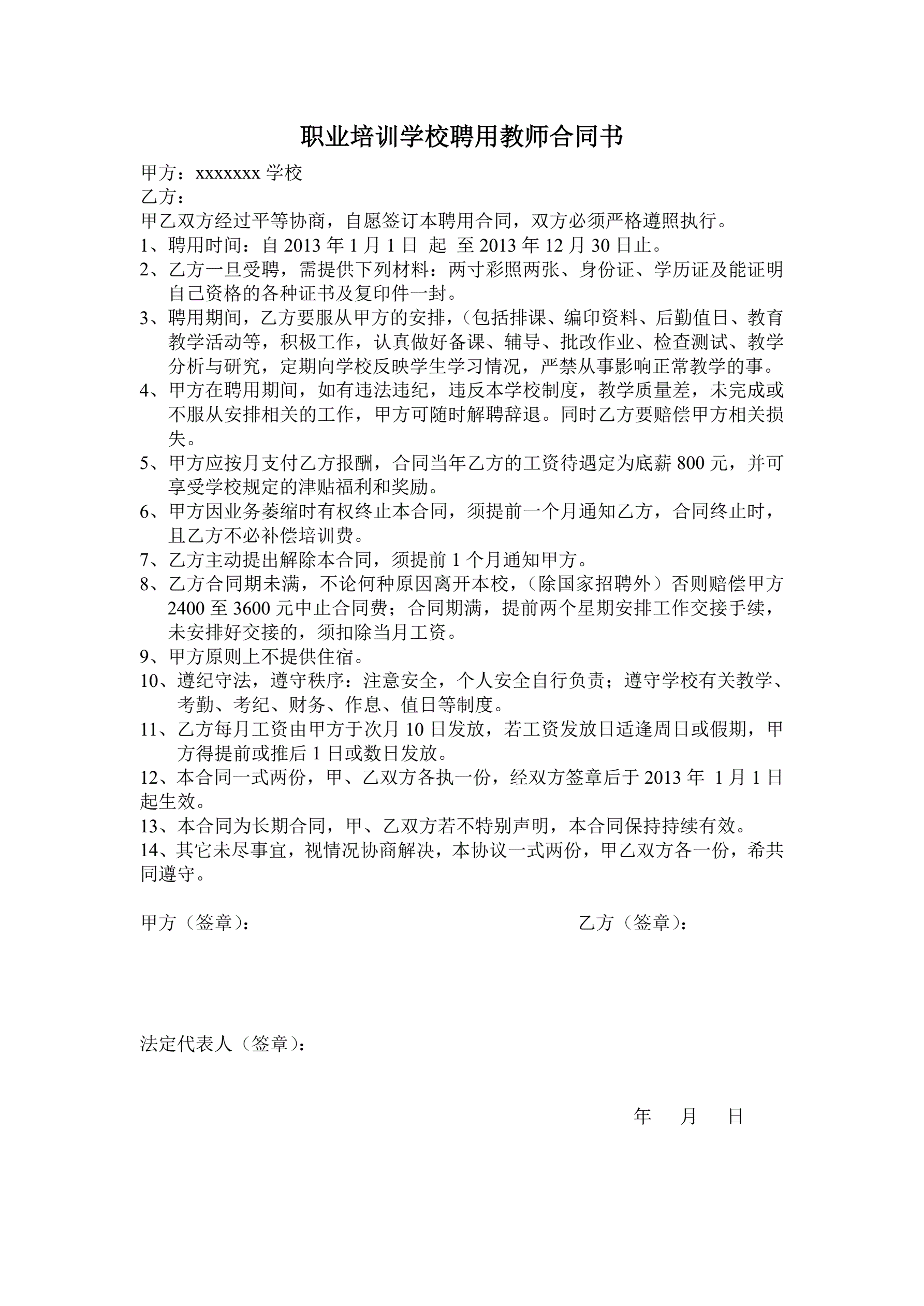 职业学校聘用教师合同
