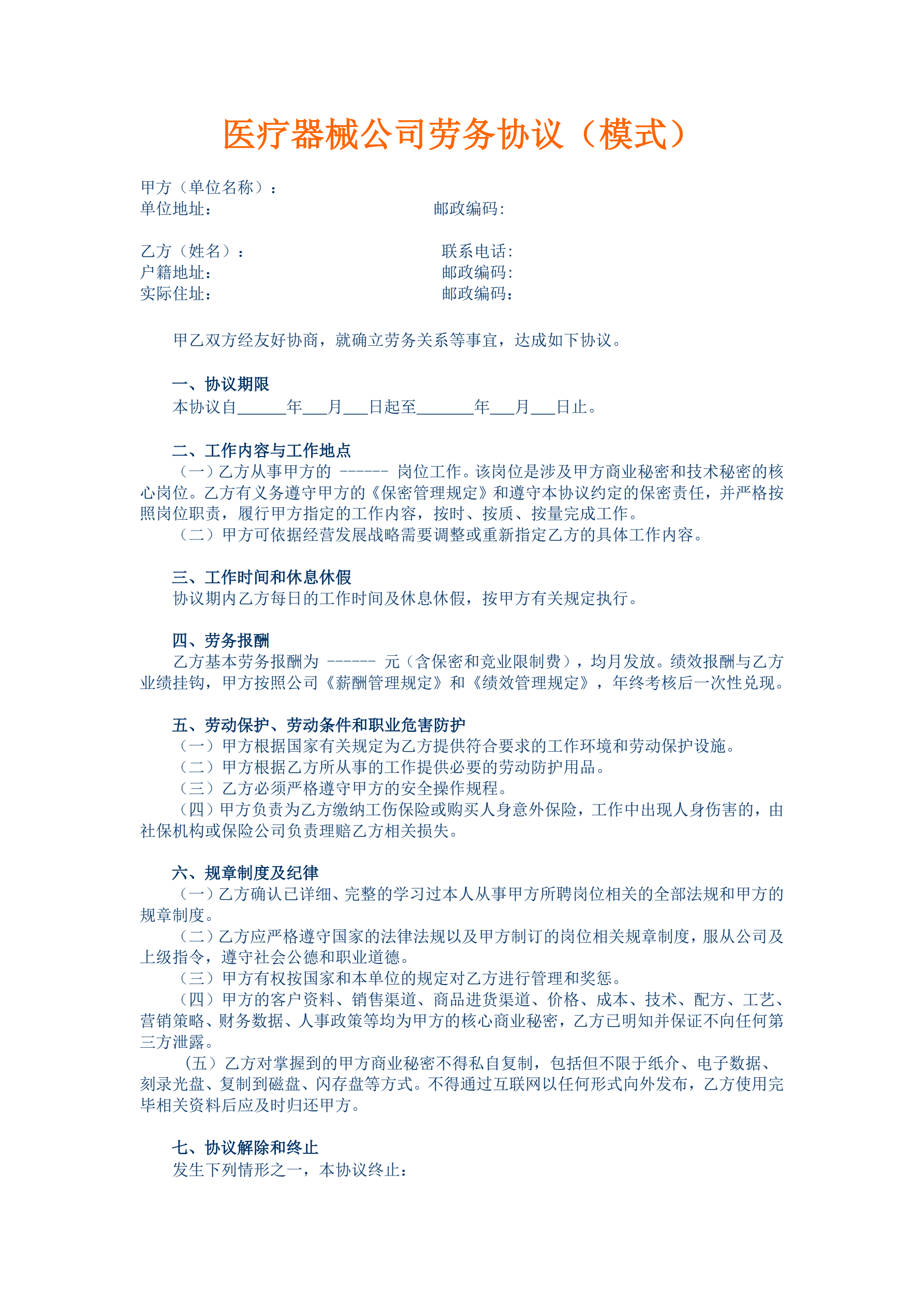 医疗器械公司劳务协议(模式)
