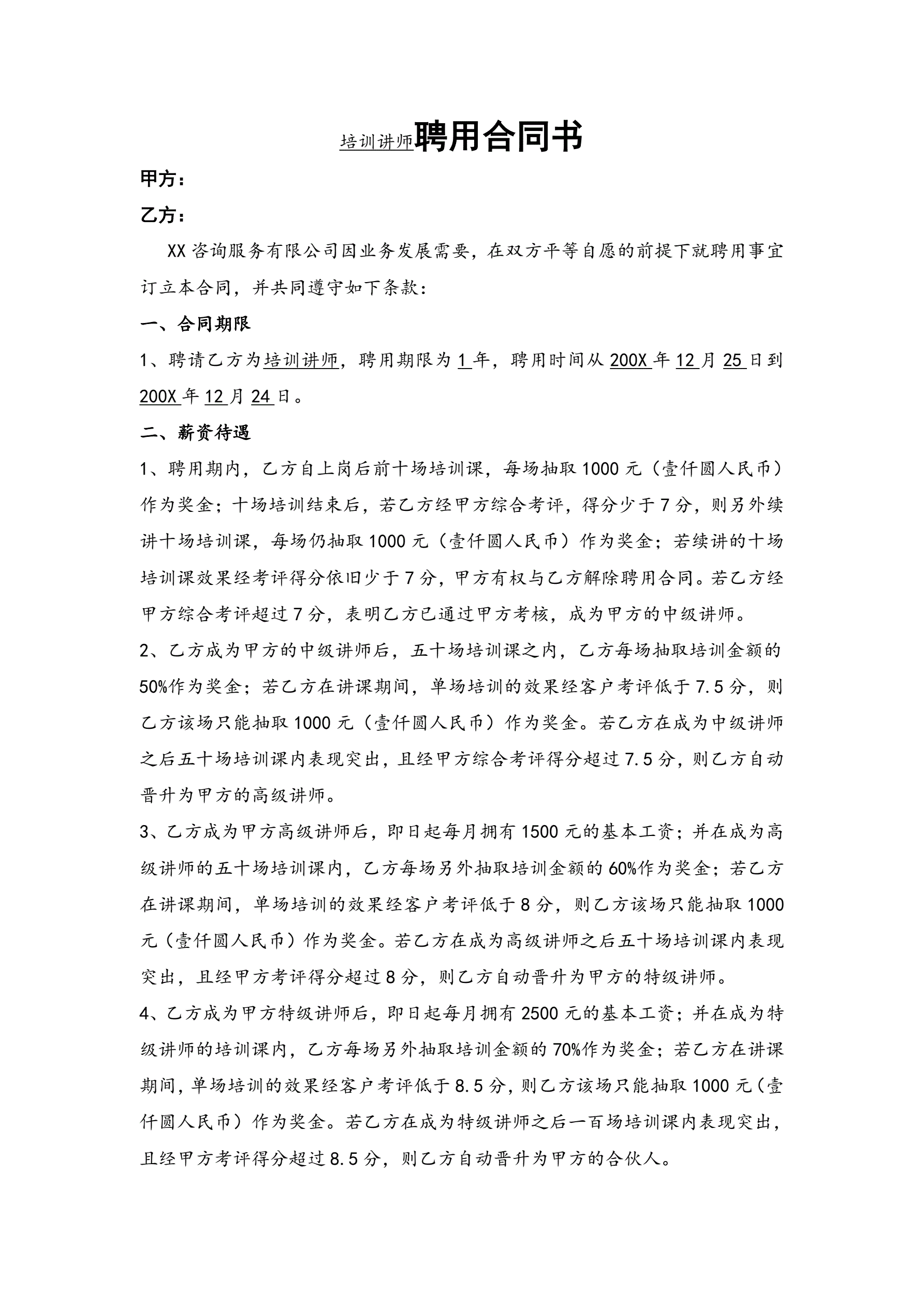 培训师聘用合同书