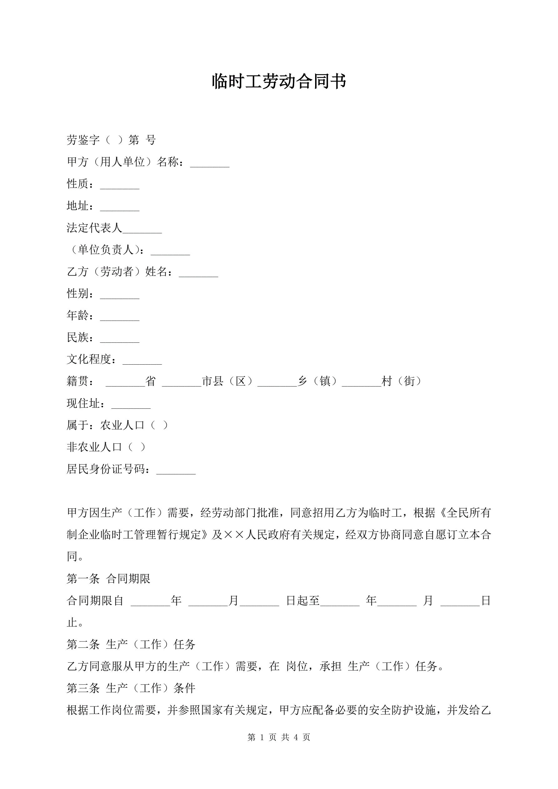临时工劳动合同书