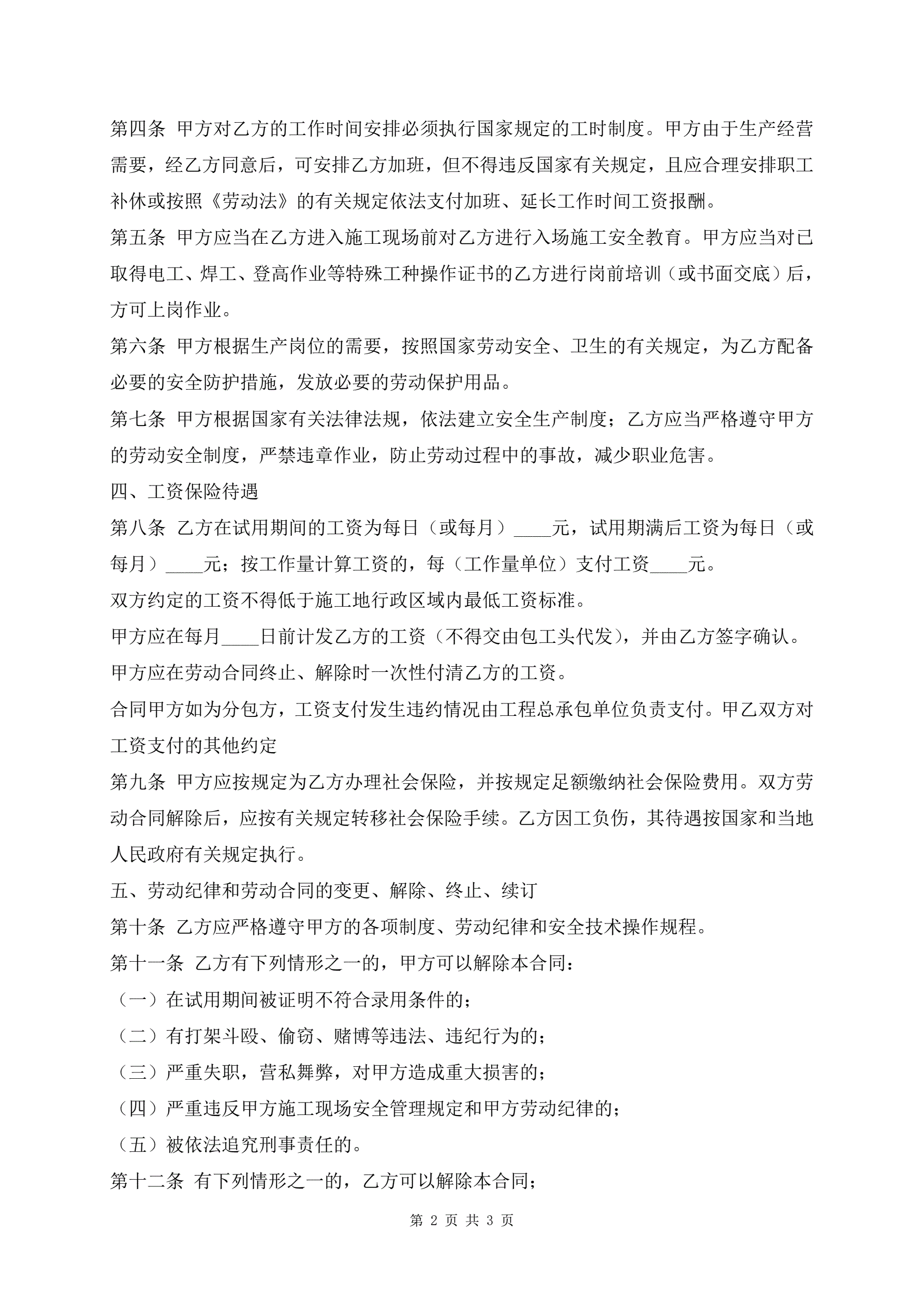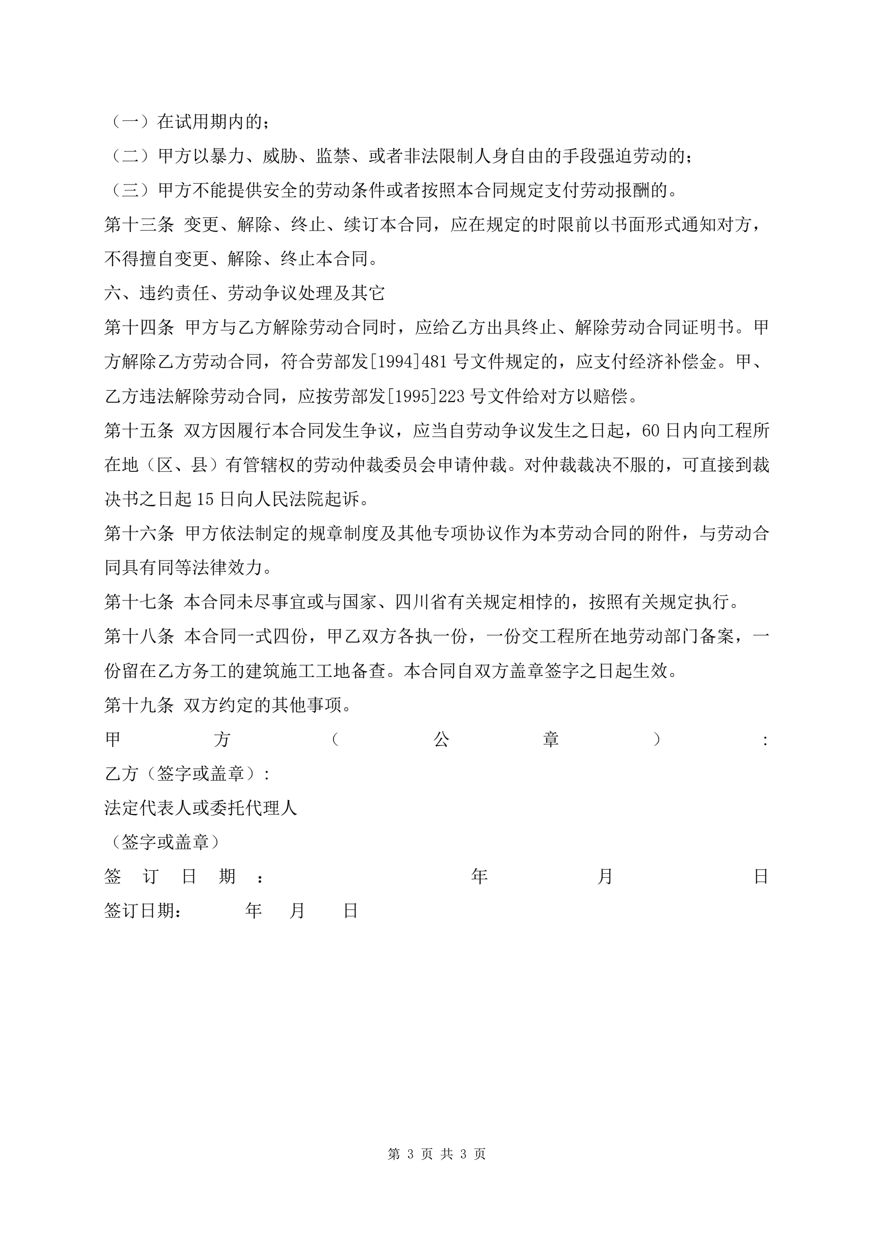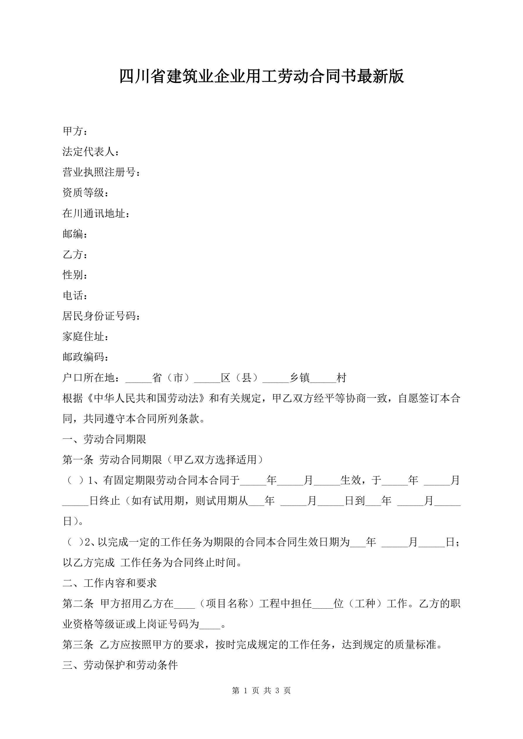 >四川省建筑业企业用工劳动合同书最新版