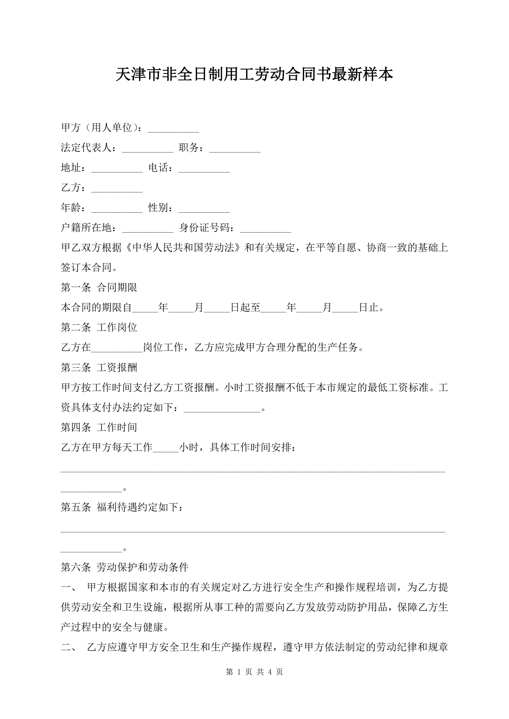 天津市非全日制用工劳动合同书最新样本