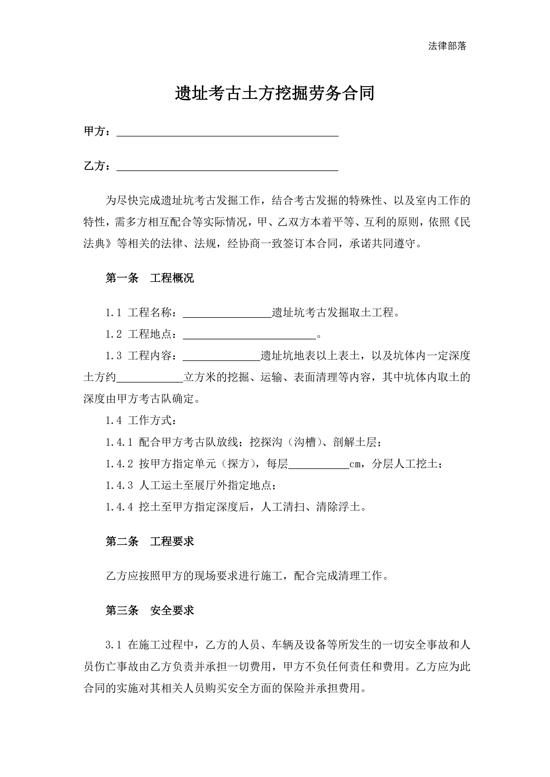 >遗址考古土方挖掘劳务合同