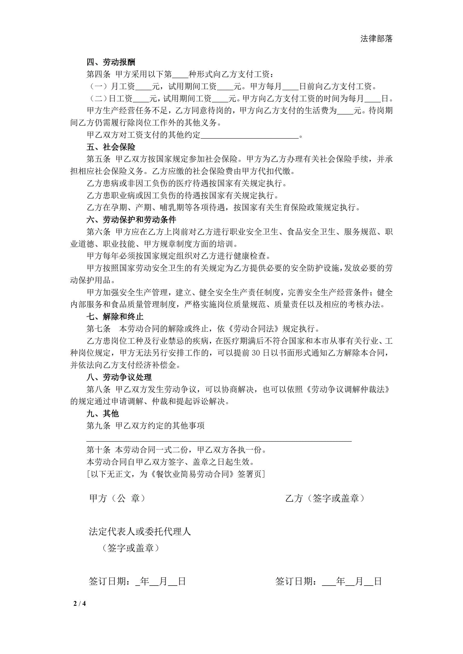 餐饮业简易劳动合同