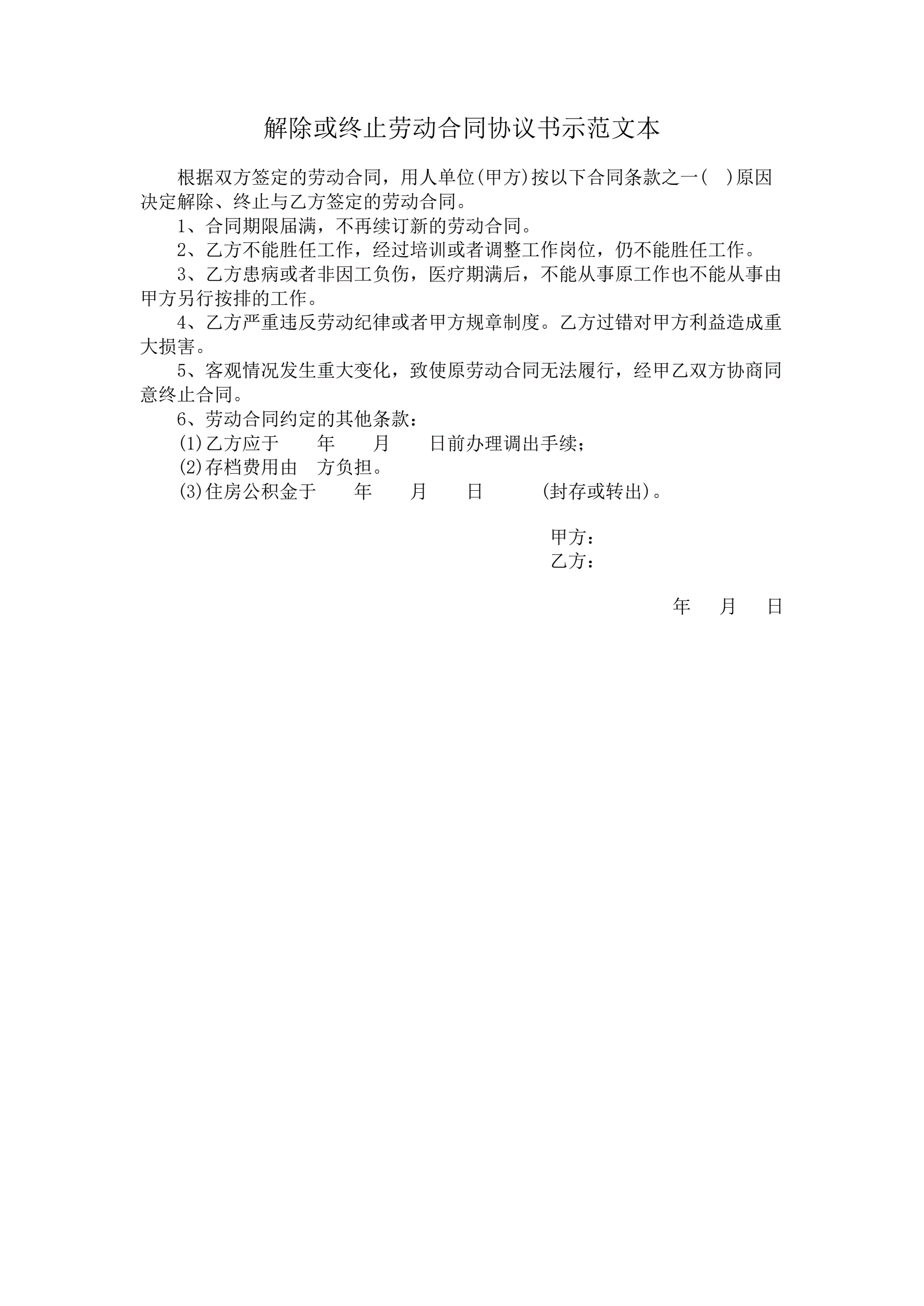 >解除或终止劳动合同协议书示范文本