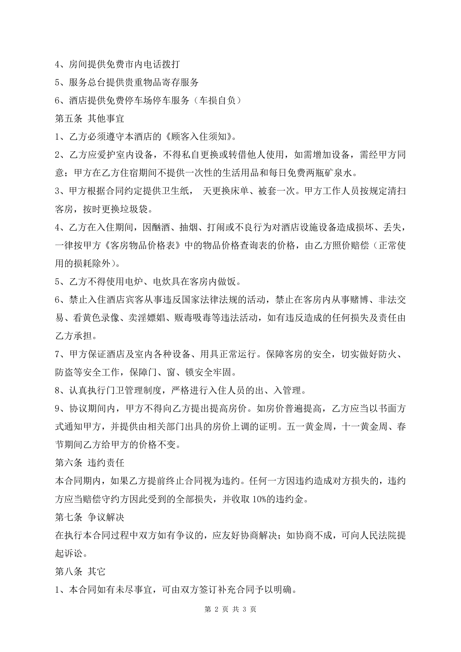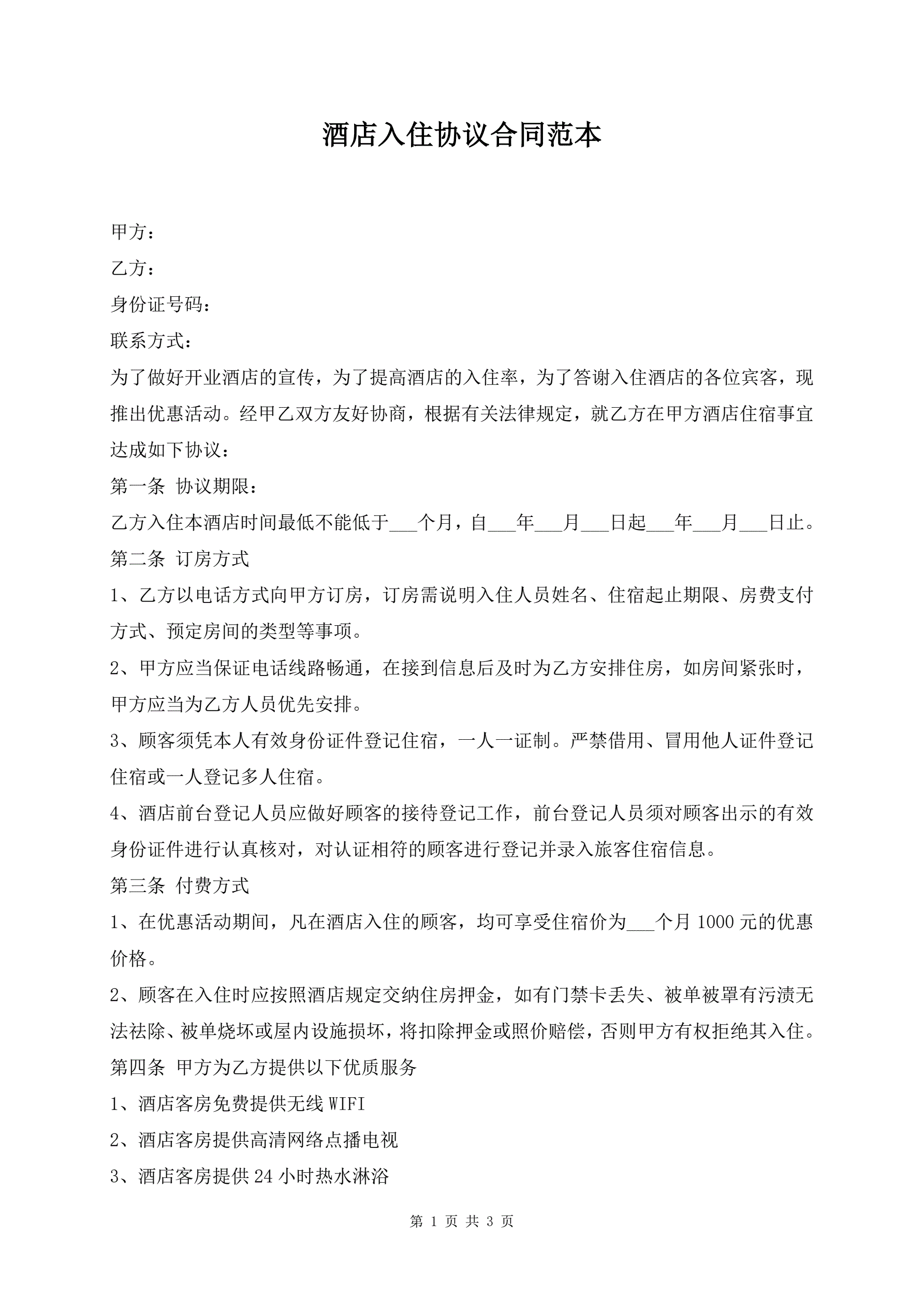 酒店入住协议合同范本