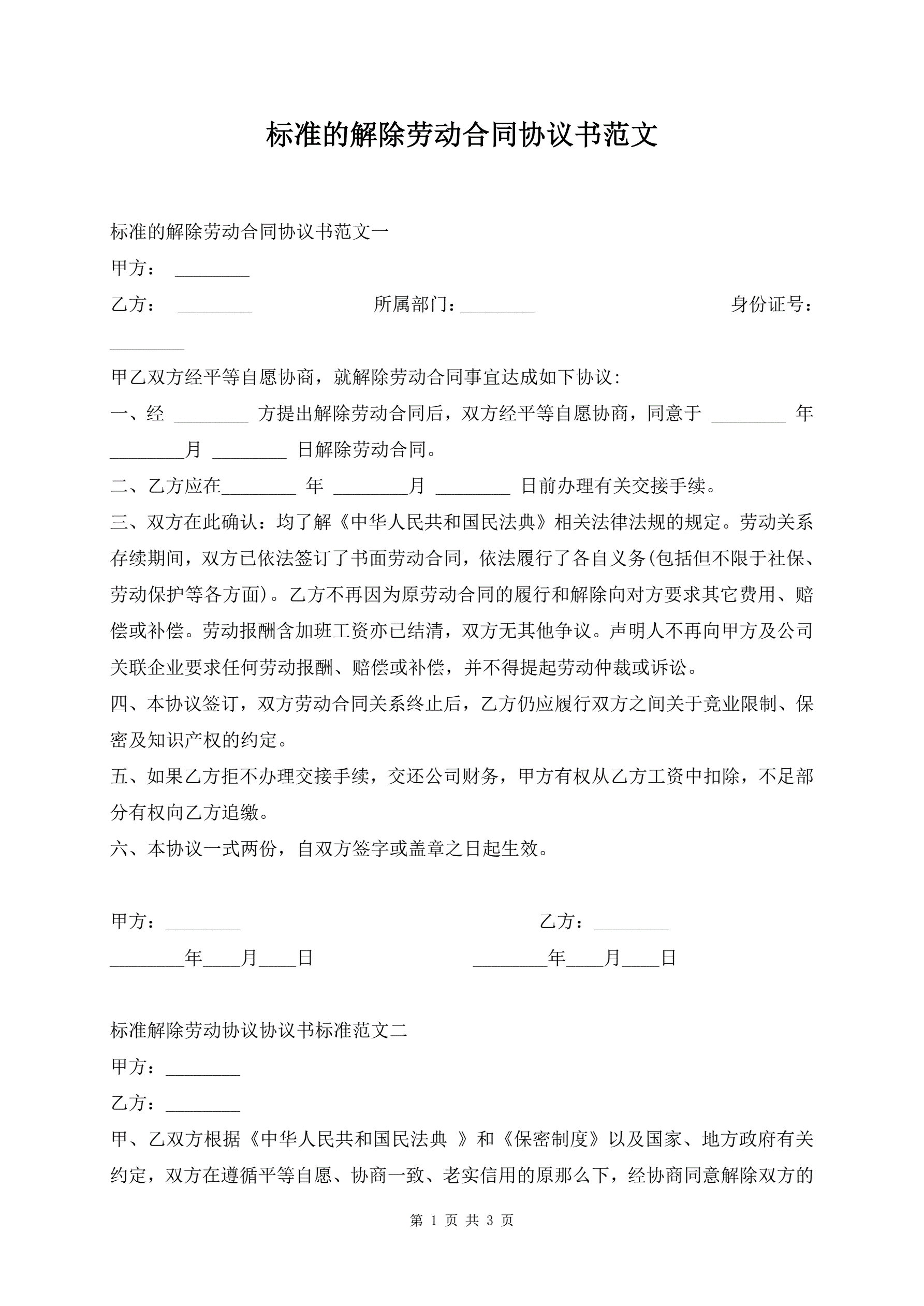 标准的解除劳动合同协议书范文