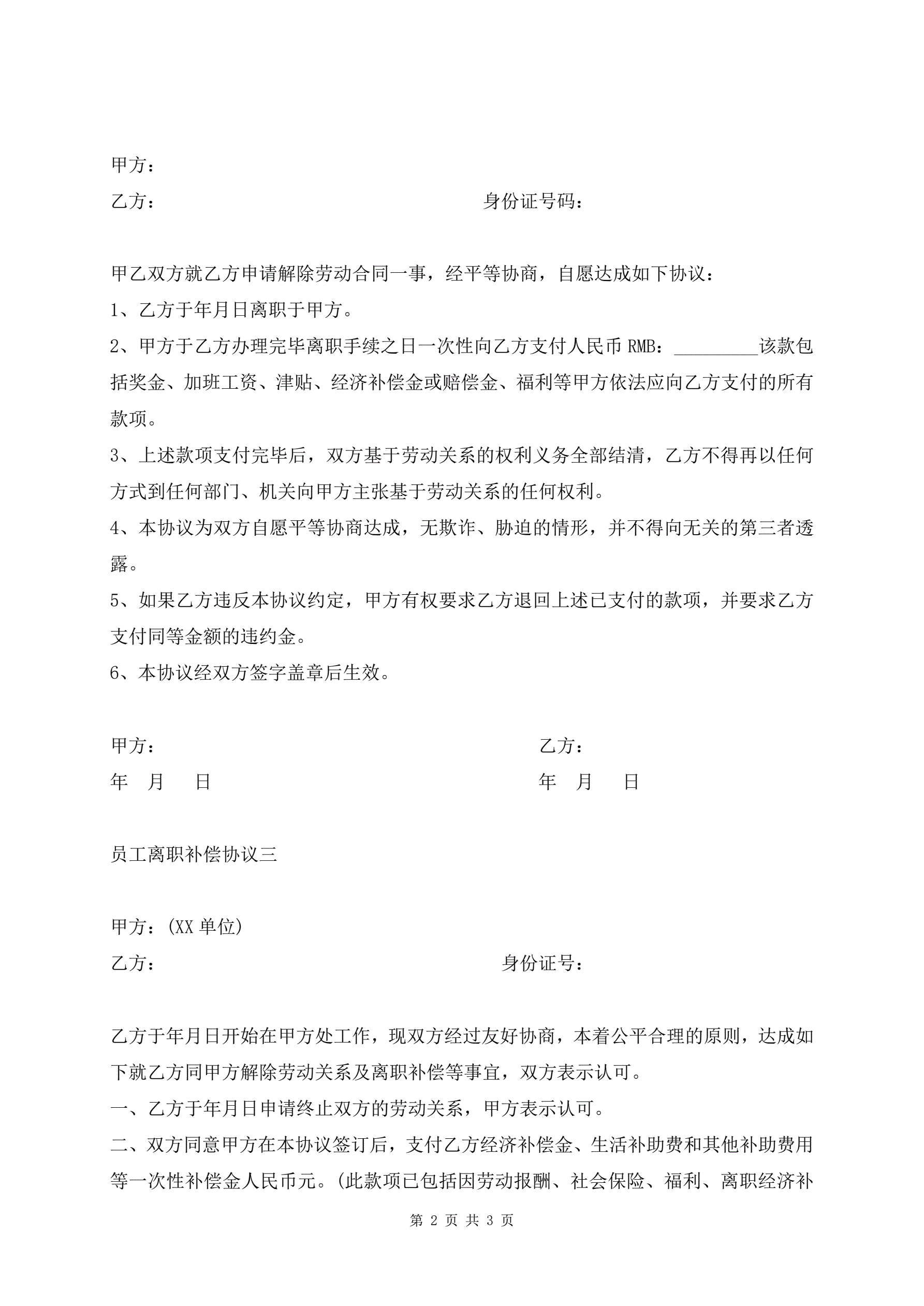 员工离职补偿协议