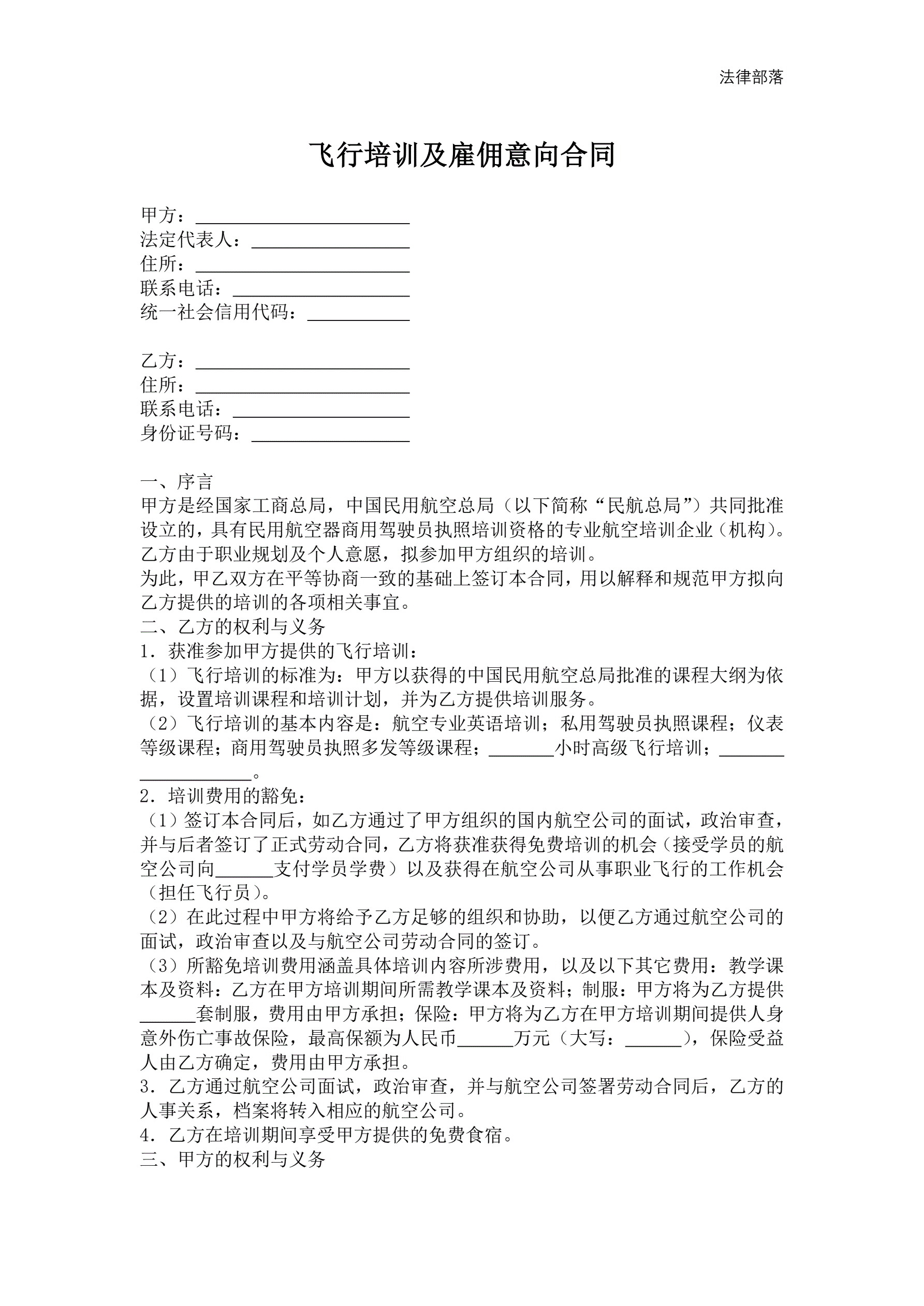 >飞行培训及雇佣意向合同