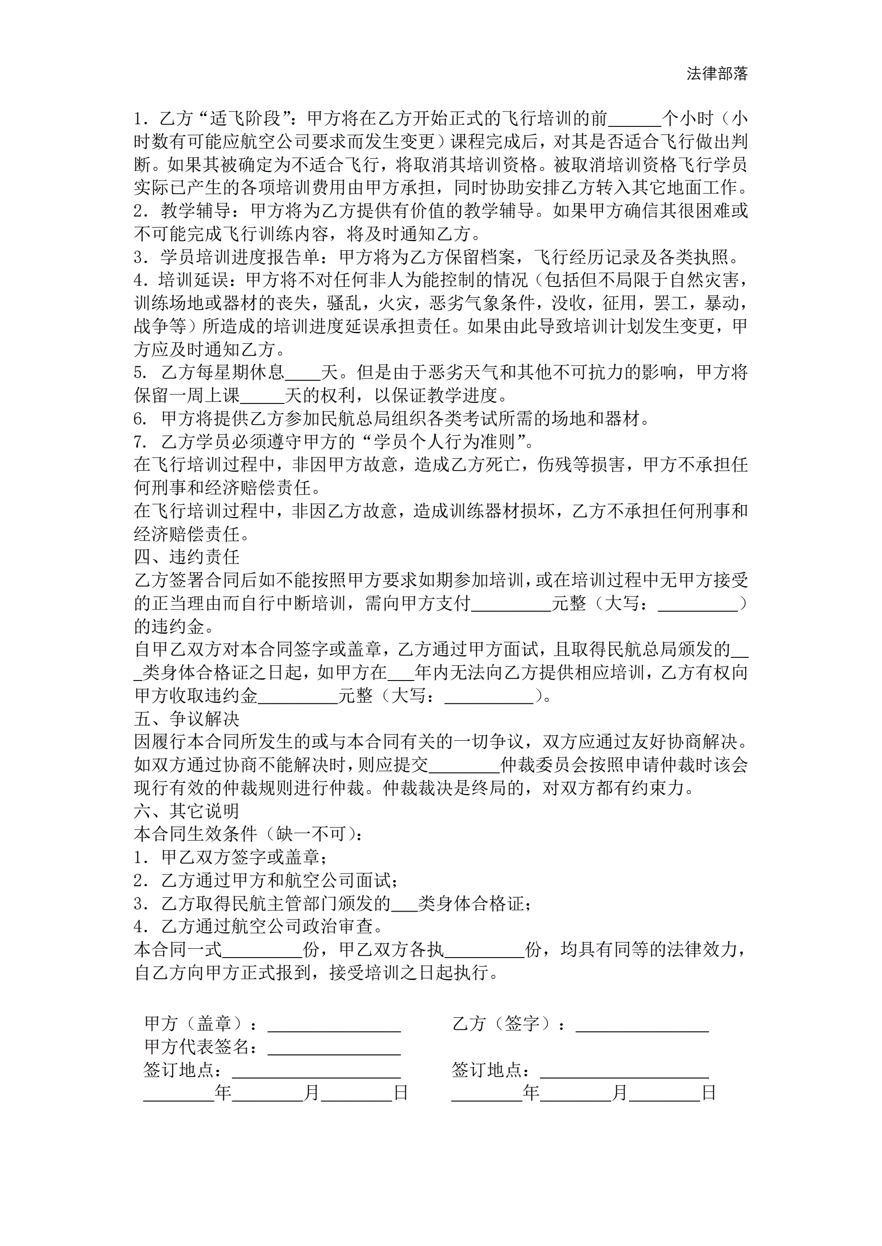 飞行培训及雇佣意向合同