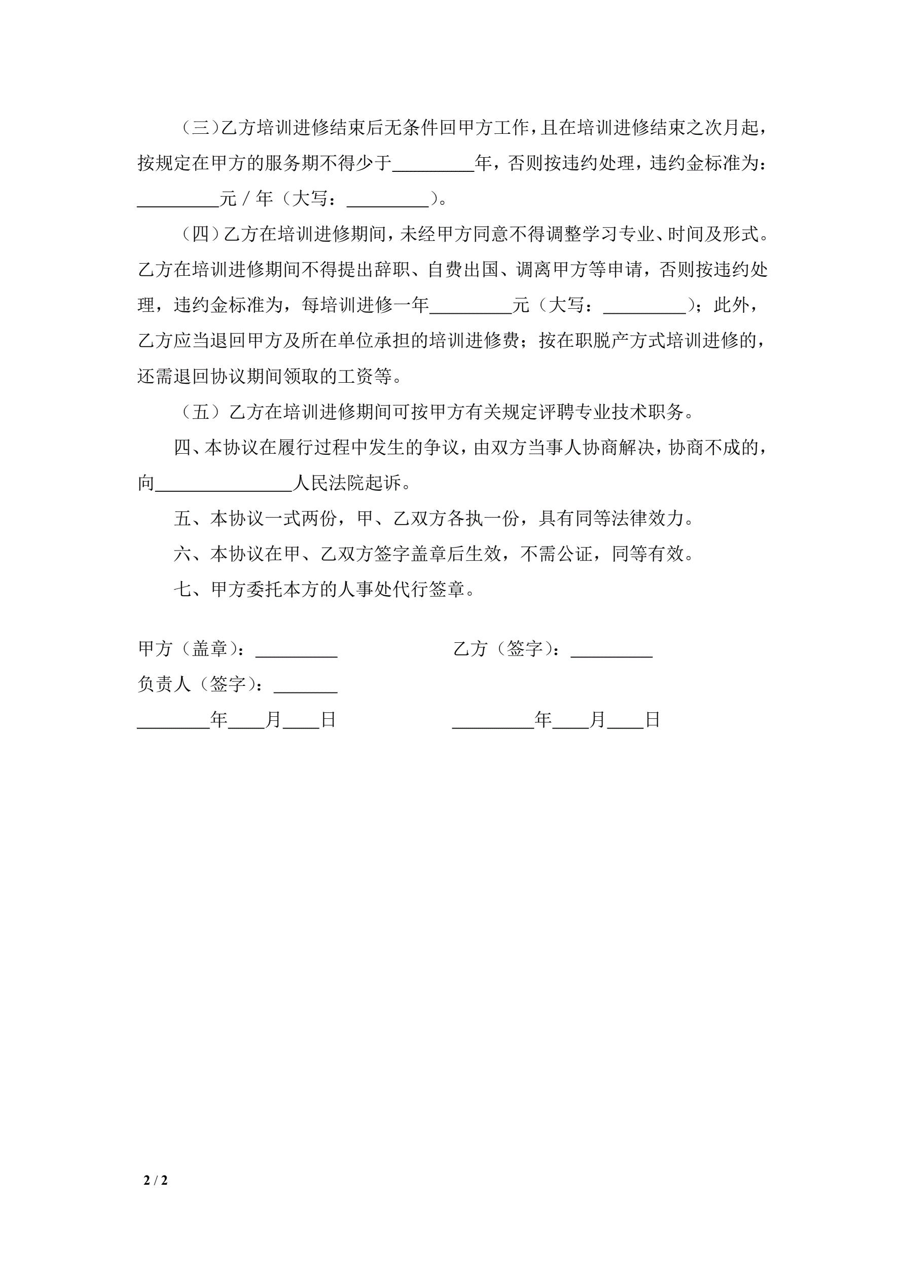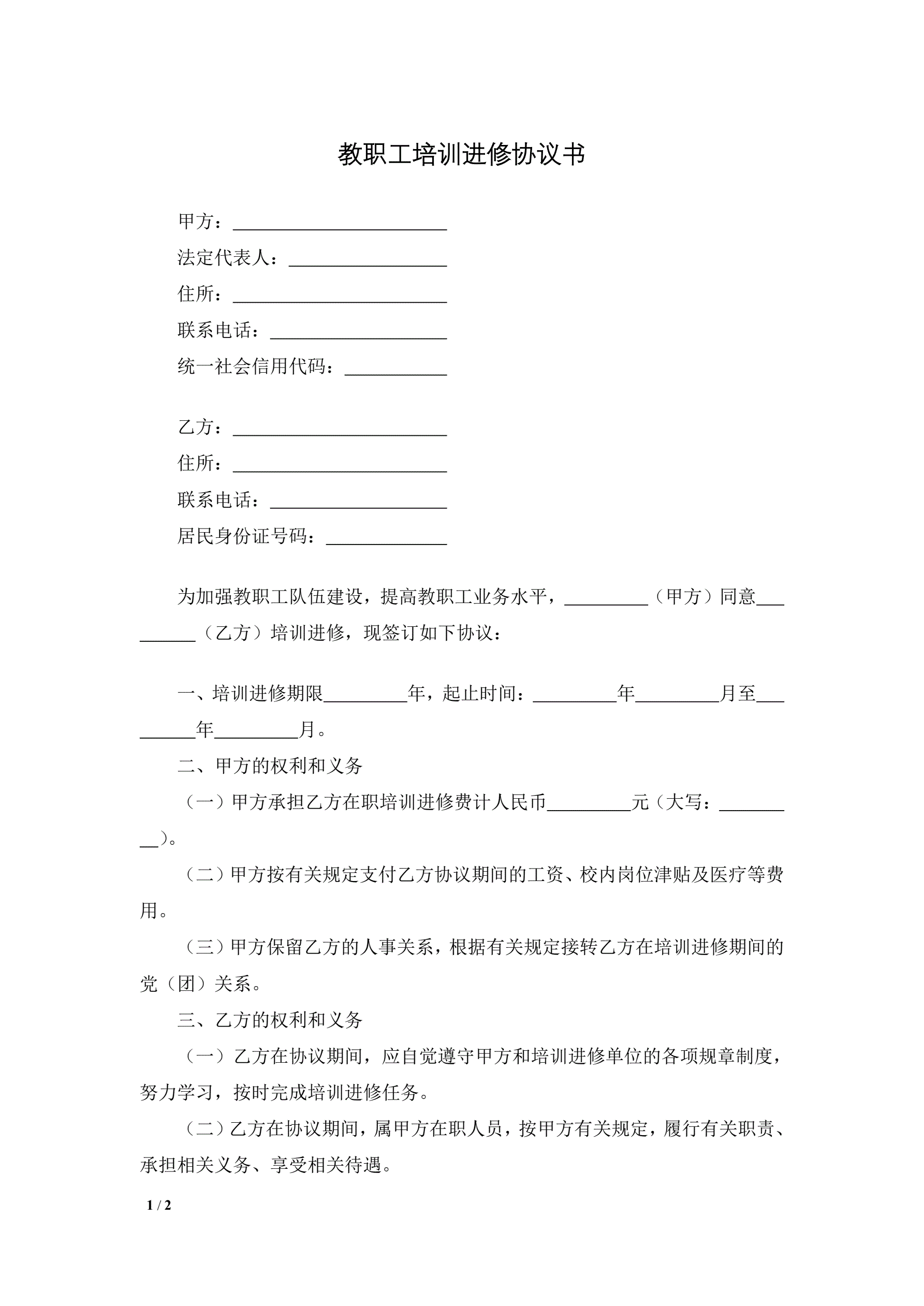 教职工培训进修协议书