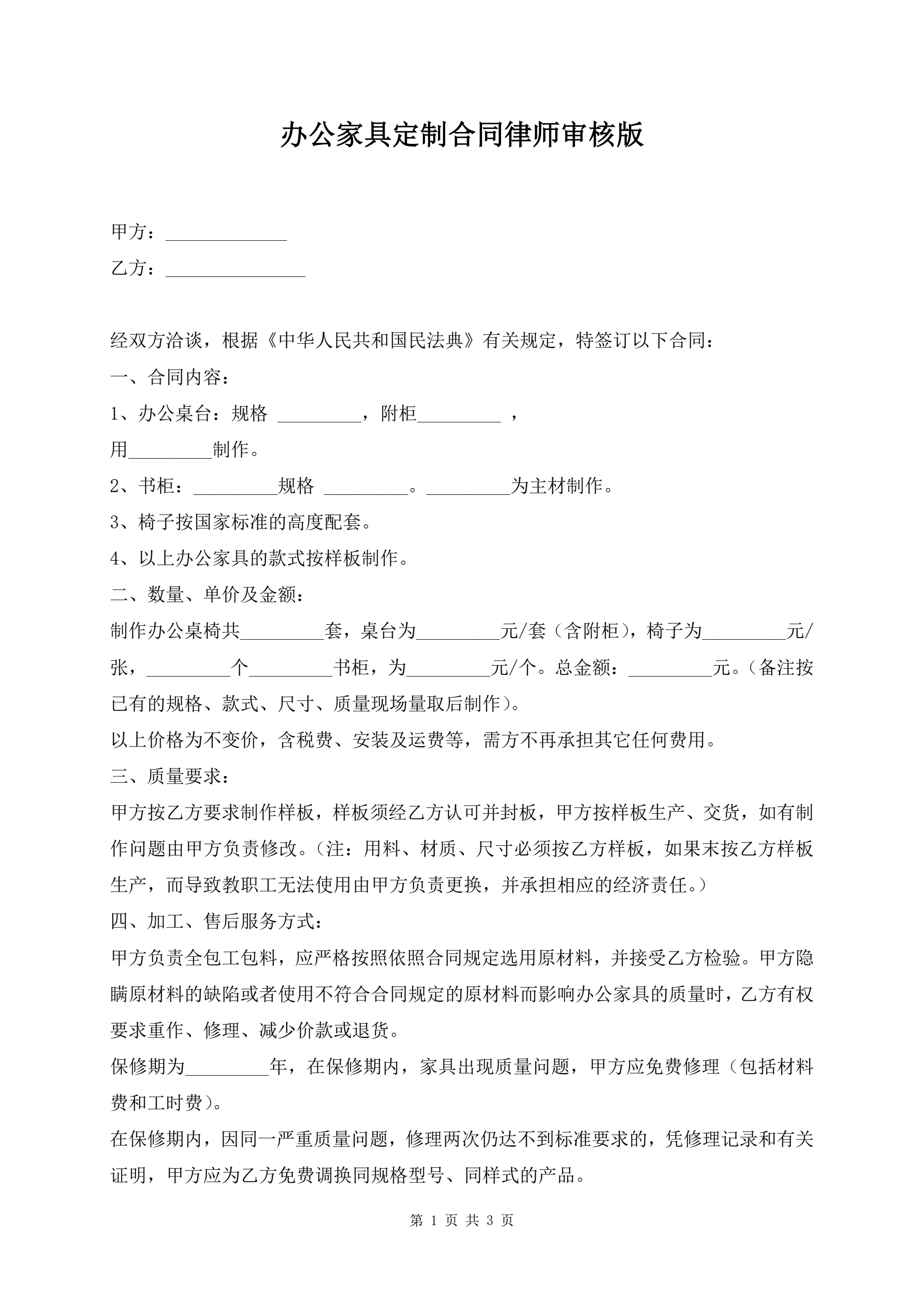 >办公家具定制合同律师审核版