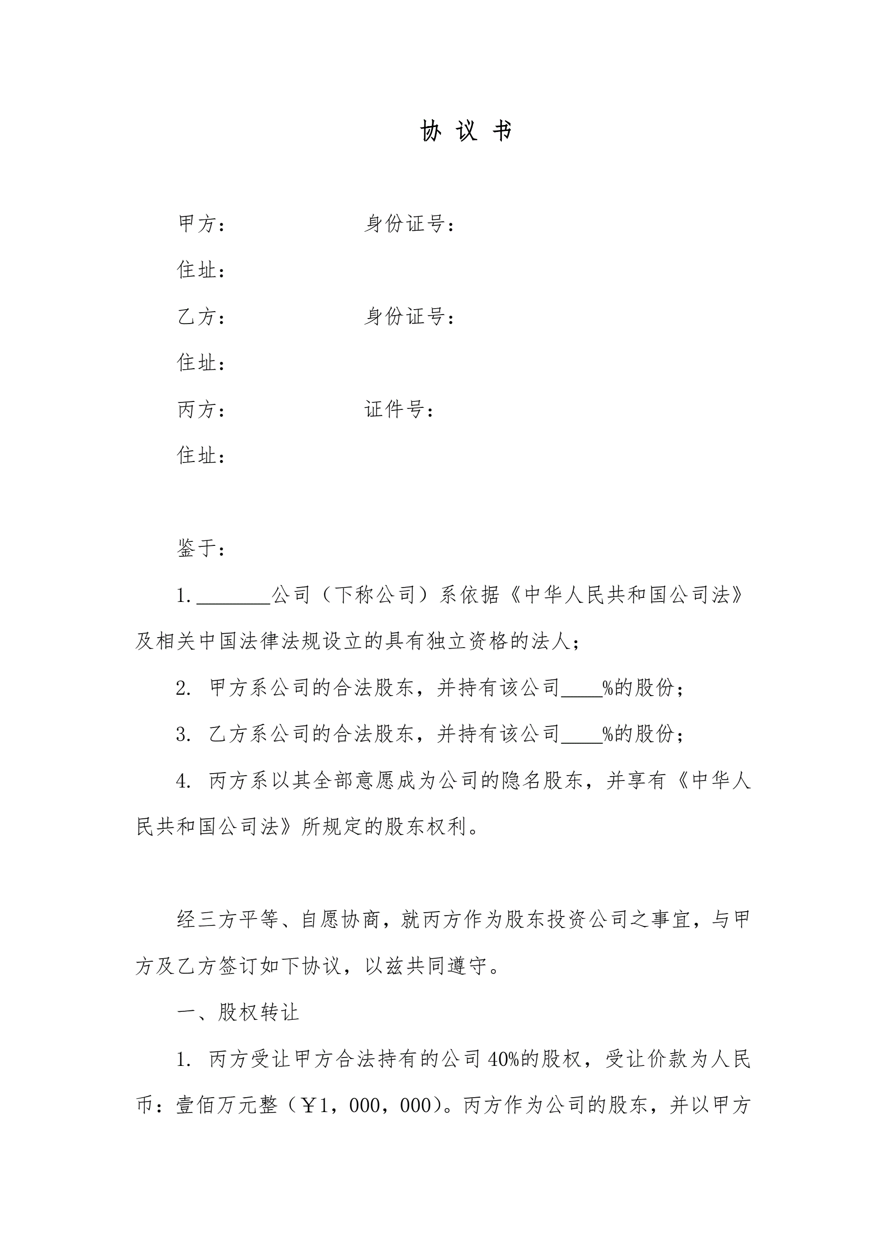 隐名股东协议书
