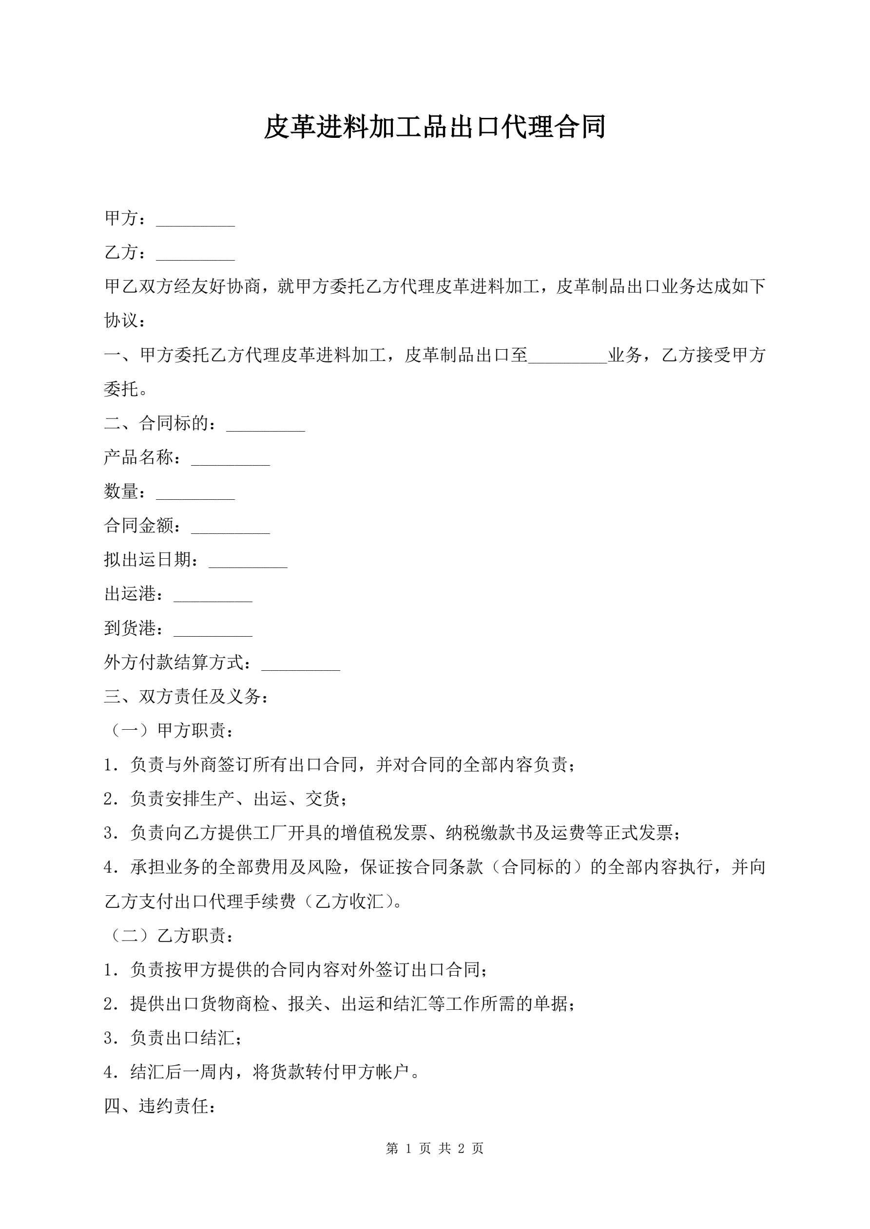 >皮革进料加工品出口代理合同