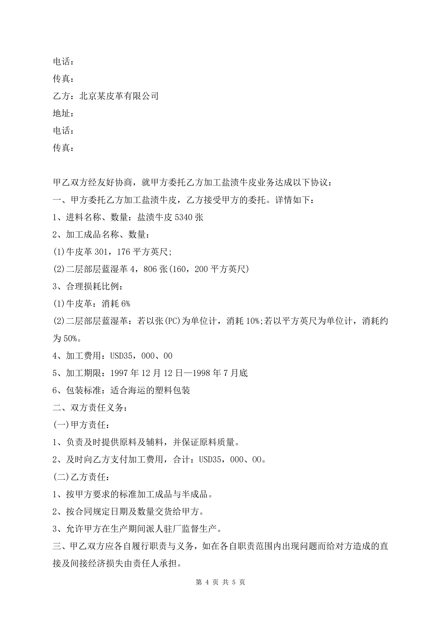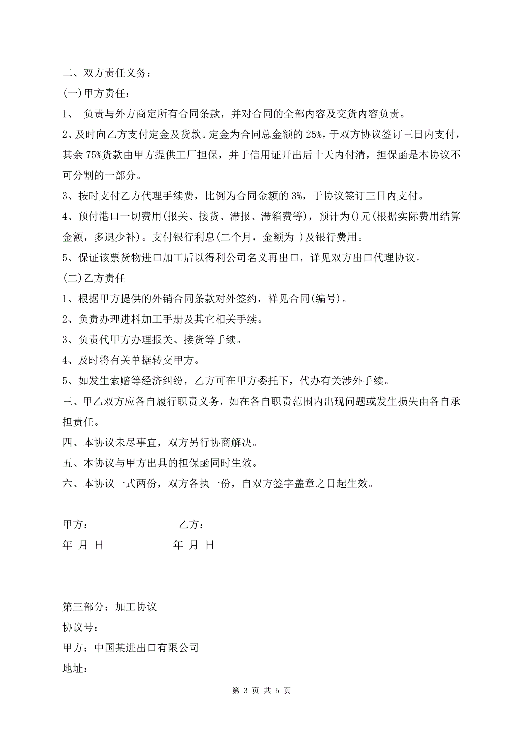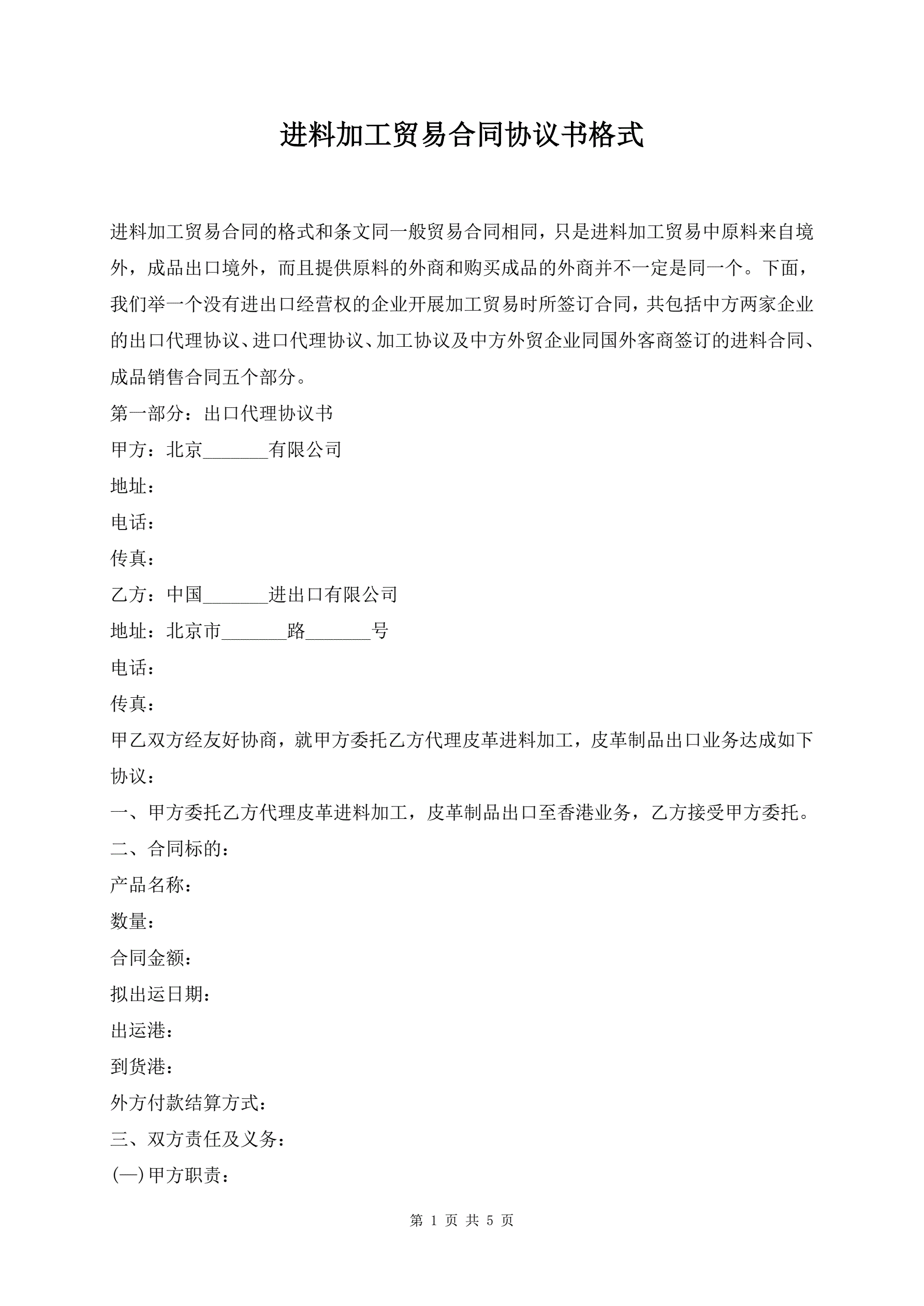 进料加工贸易合同协议书格式