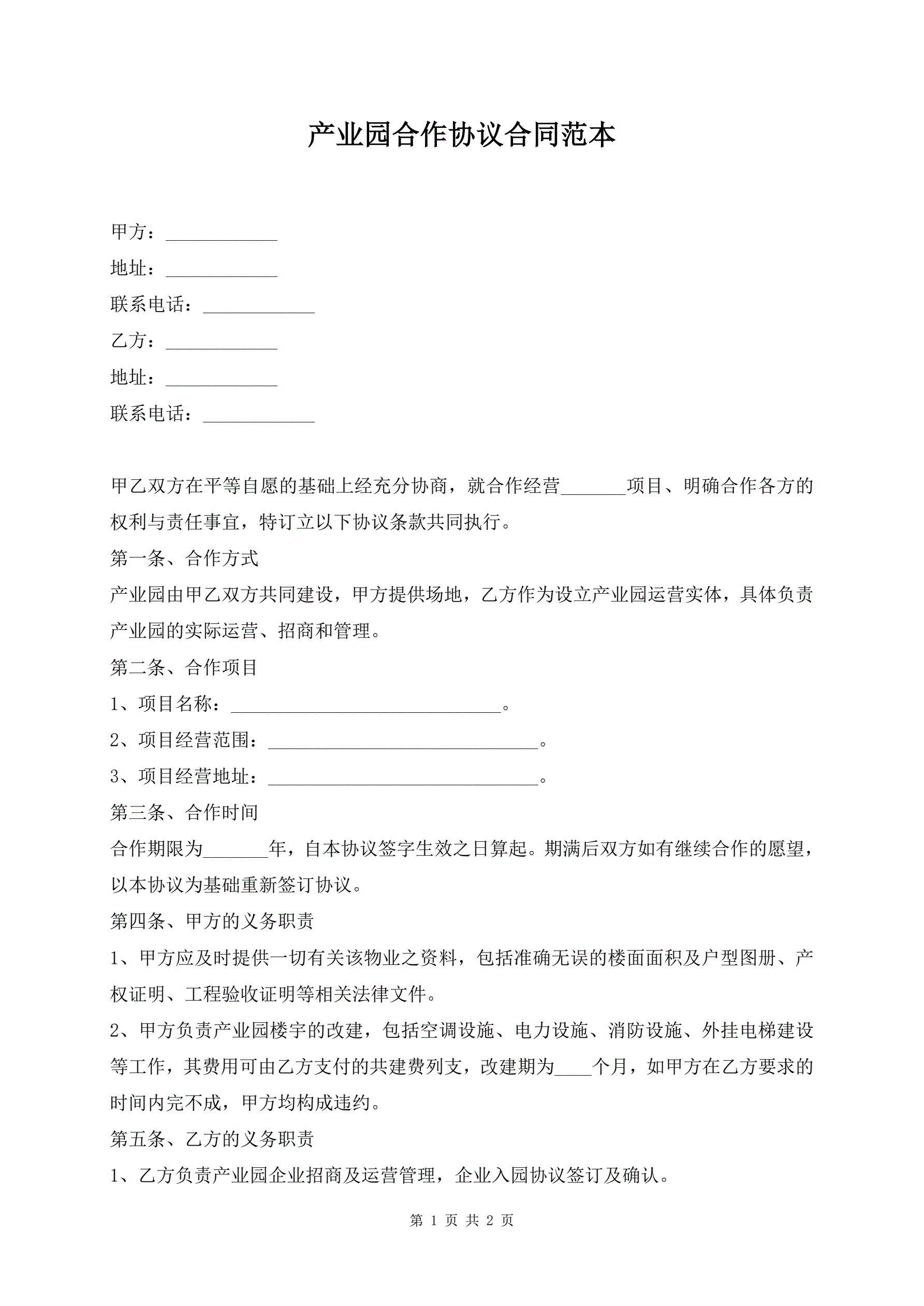 >产业园合作协议合同范本