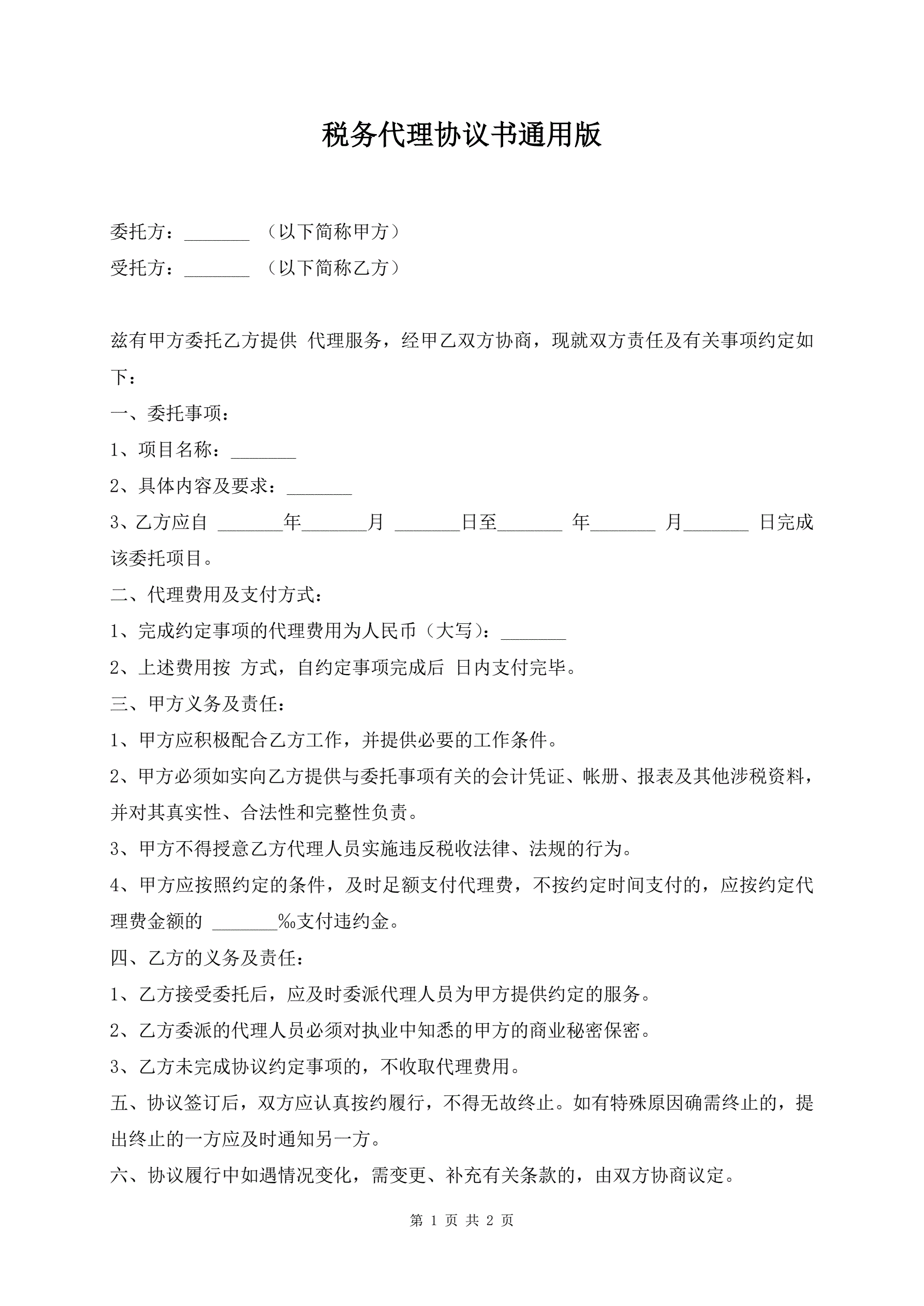 税务代理协议书通用版