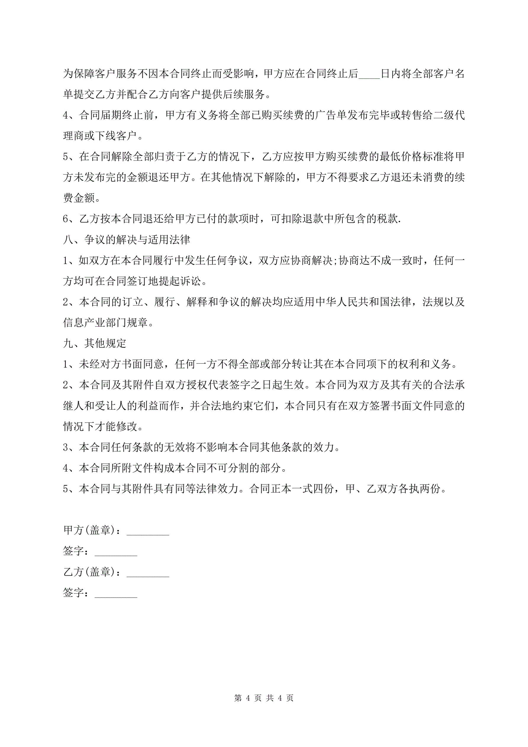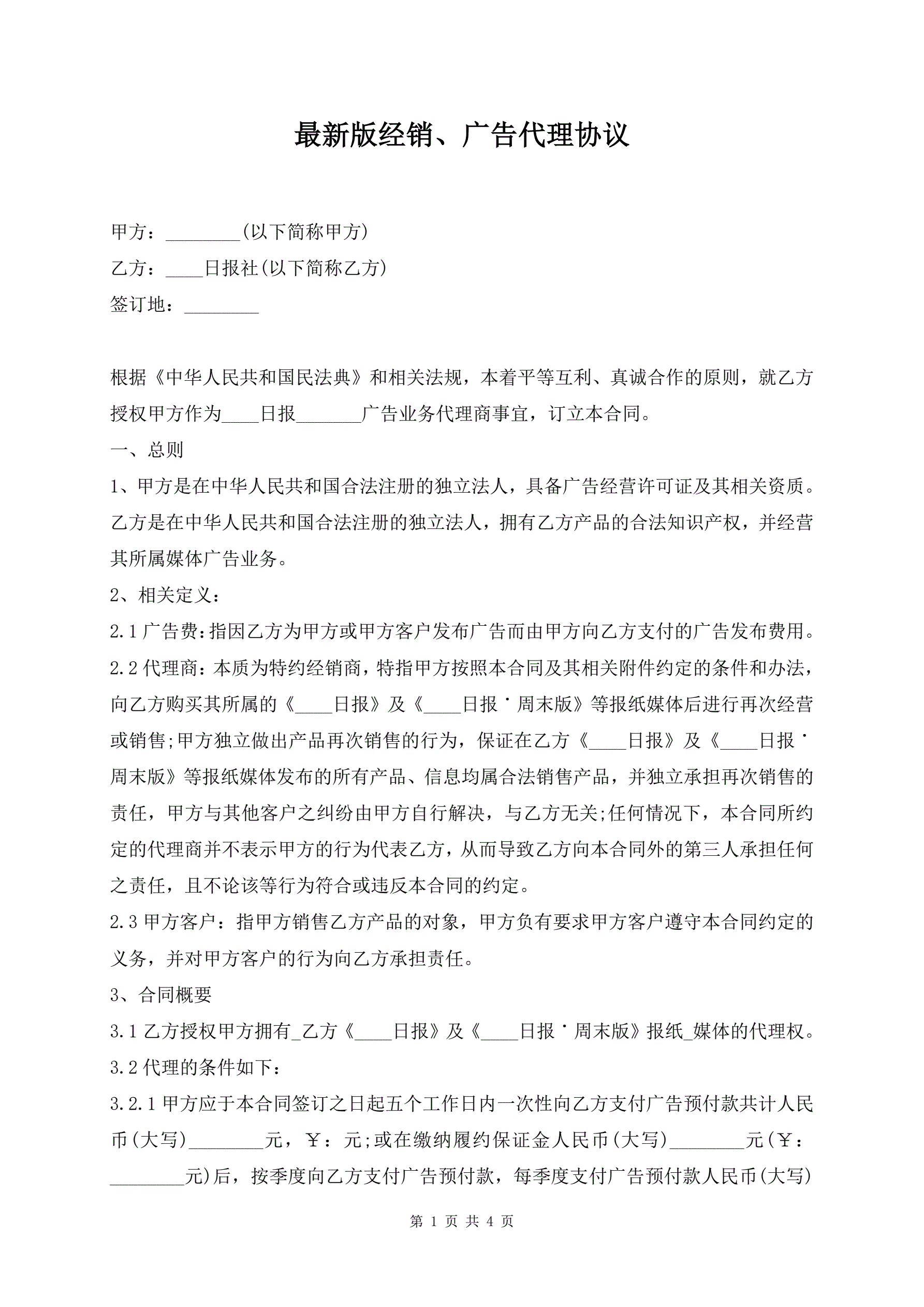 最新版经销、广告代理协议