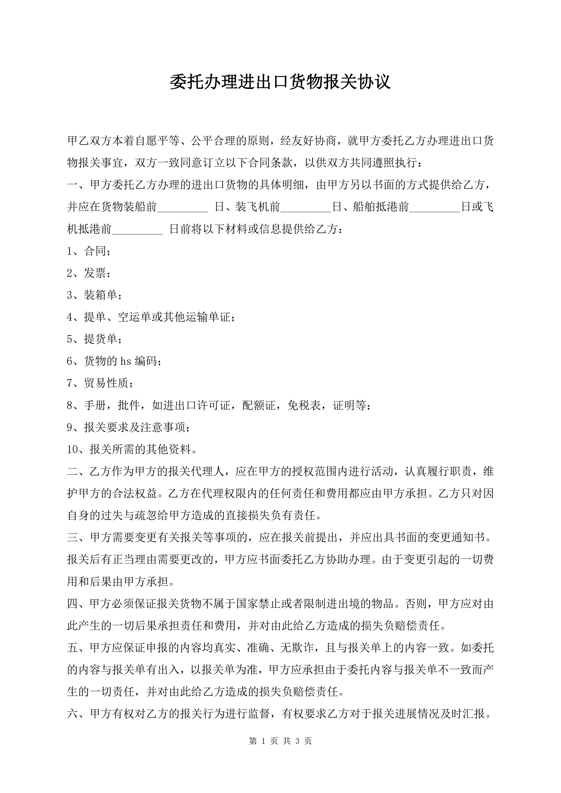 委托办理进出口货物报关协议