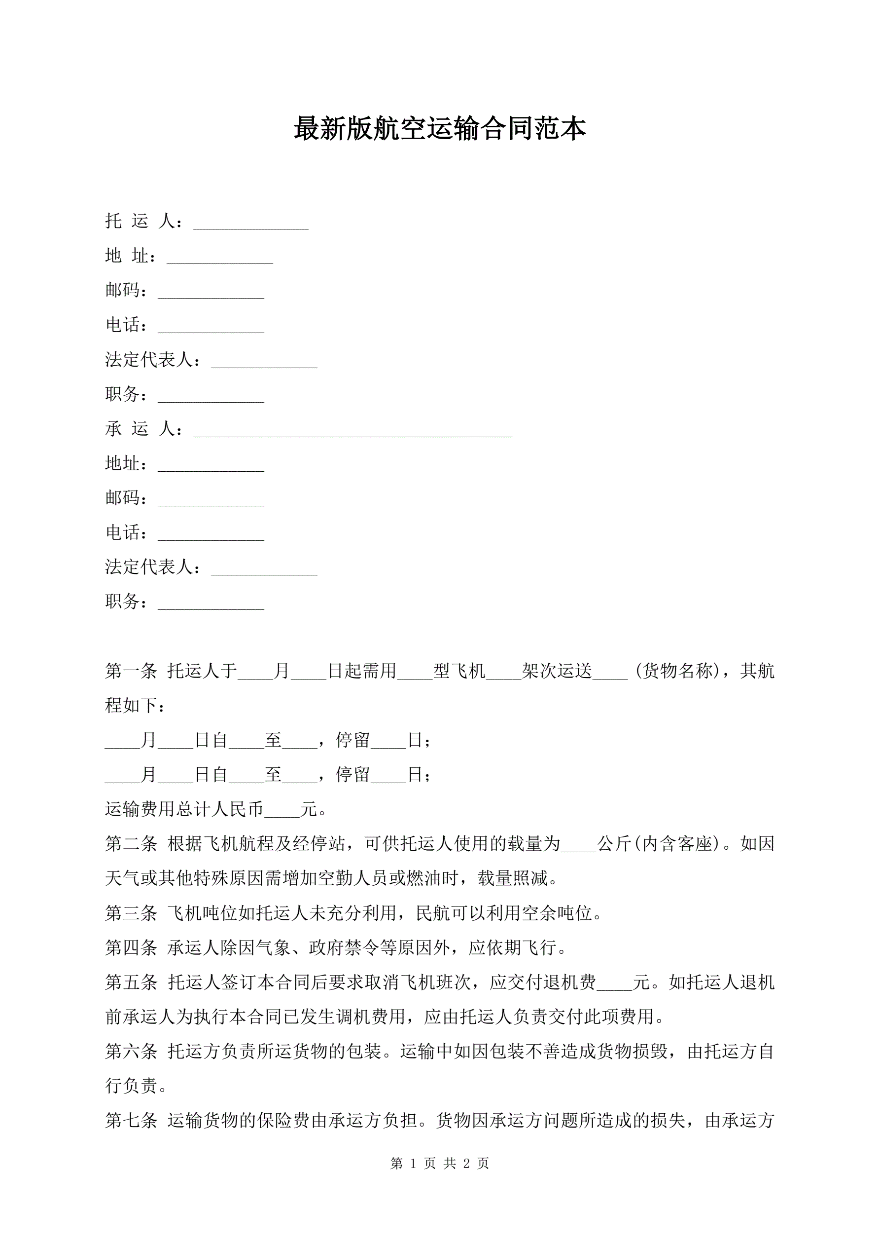 最新版航空运输合同范本