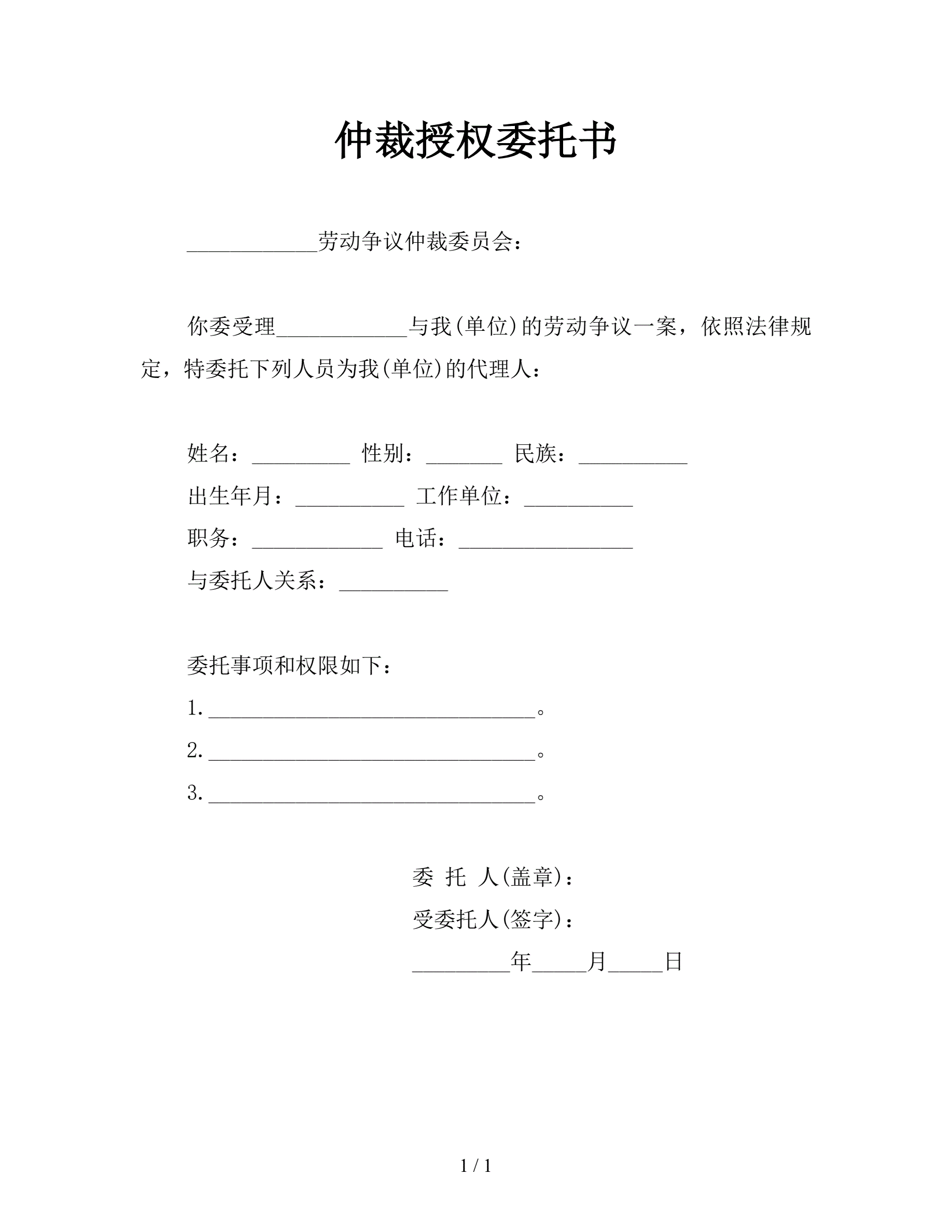 仲裁授权委托书(指导版)