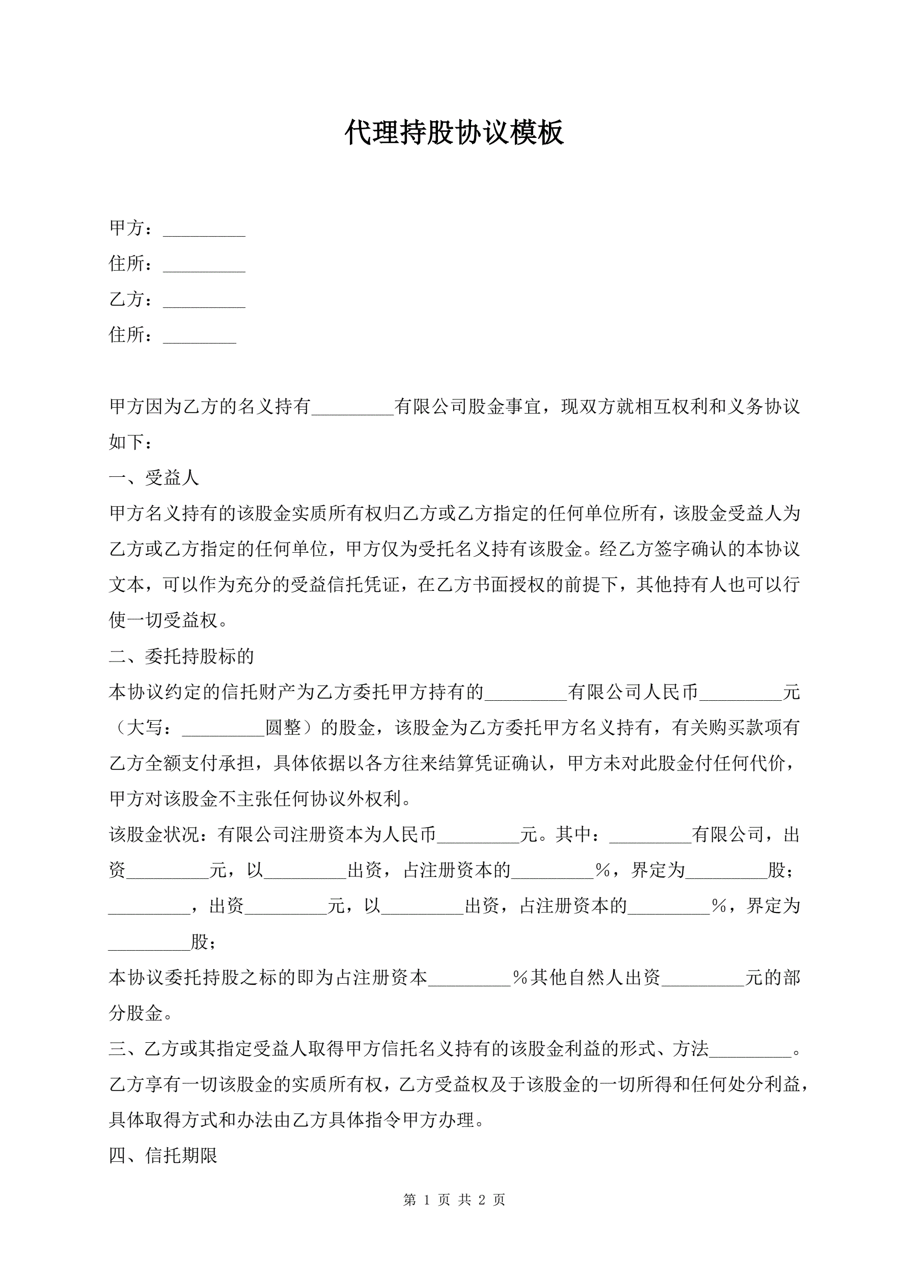 >代理持股协议模板