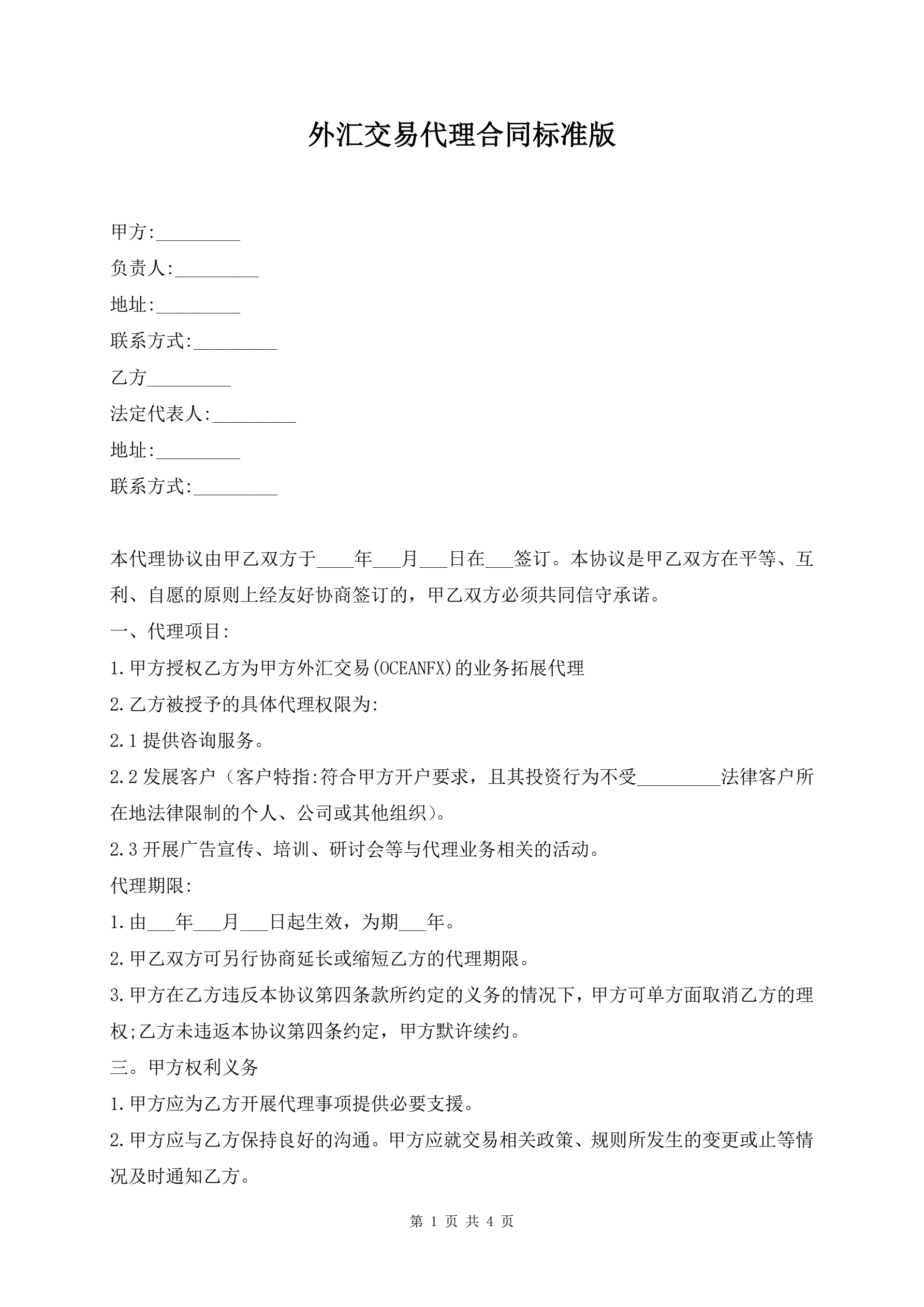 >外汇交易代理合同标准版