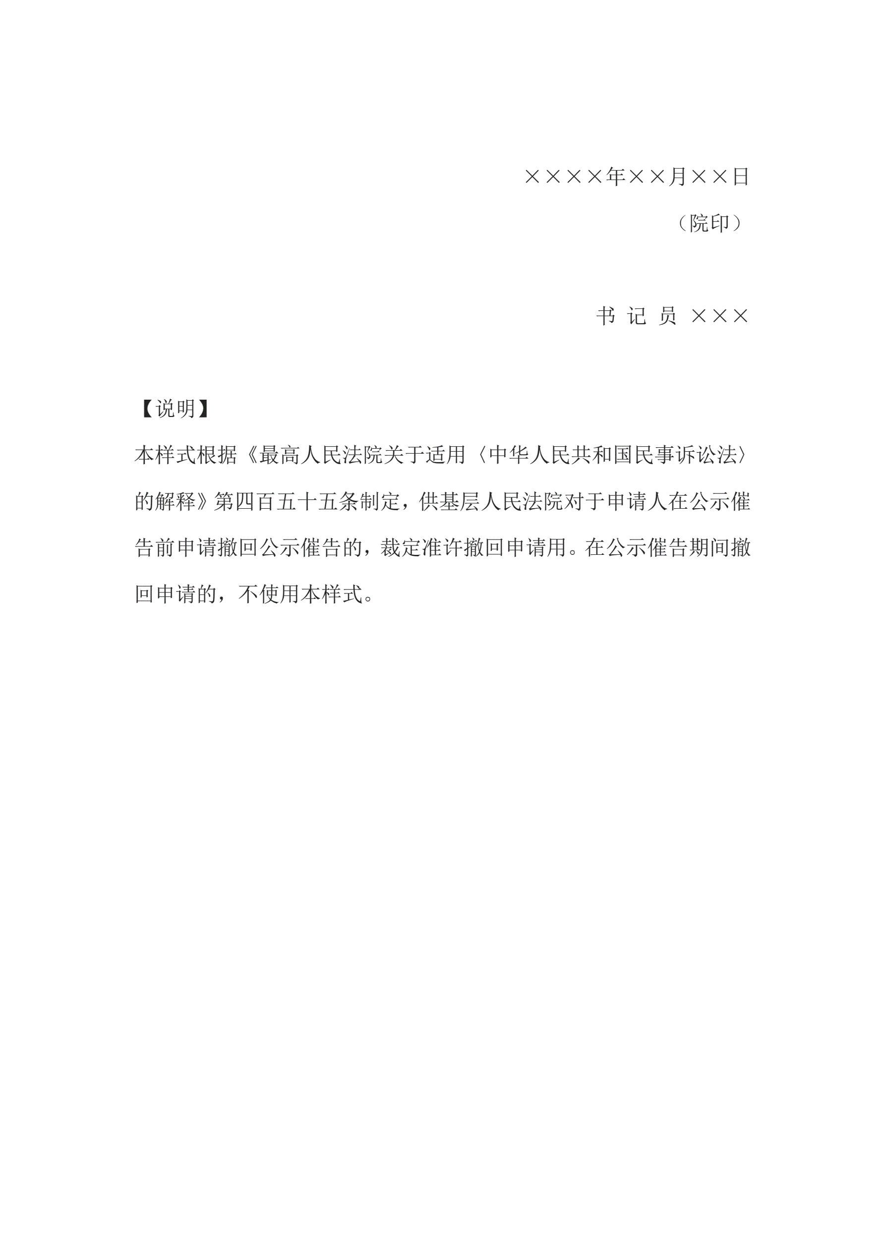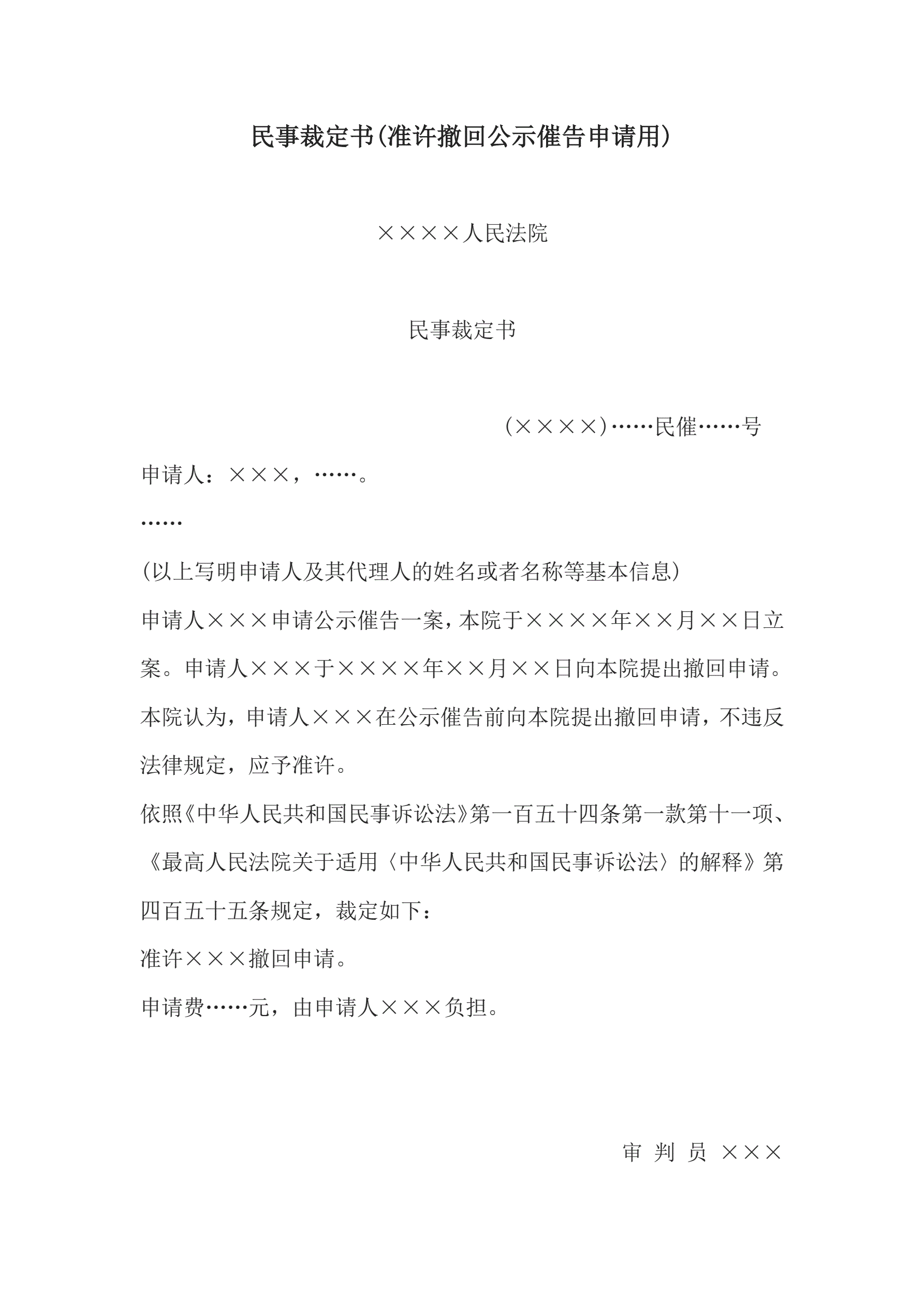 合同名称:民事裁定书(准许撤回公示催告申请用)