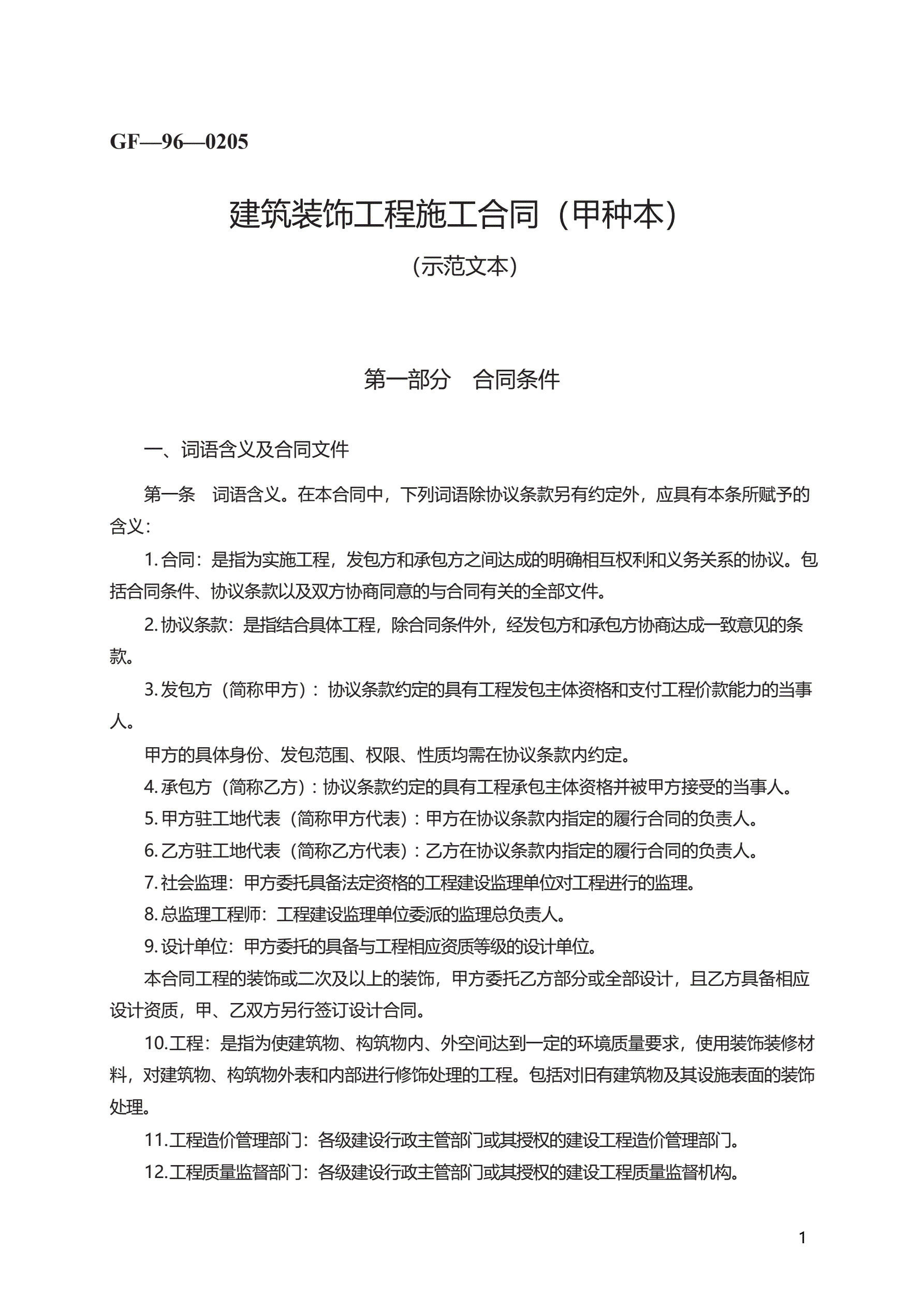 >建筑装饰工程施工合同(甲种本) GF—96—0205