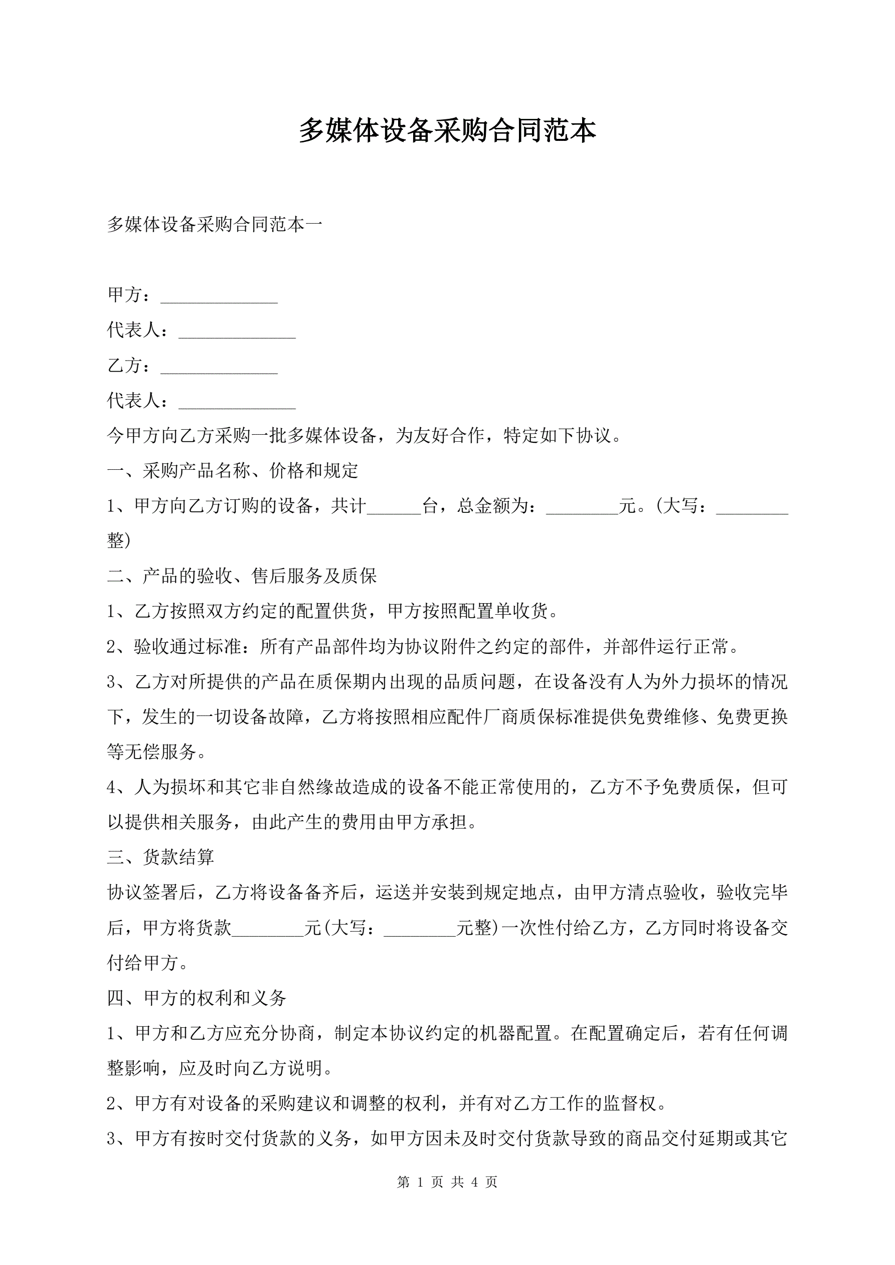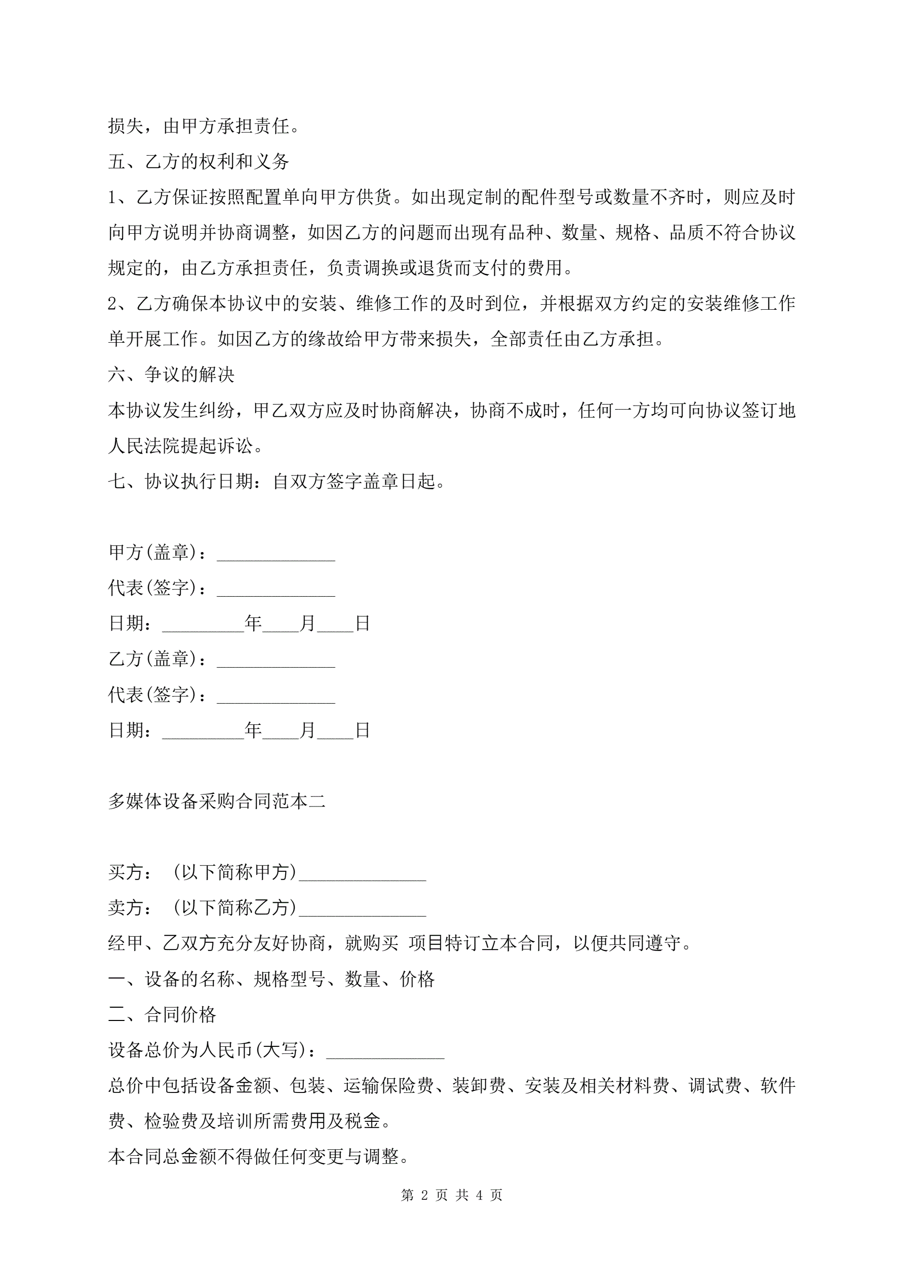 多媒体设备采购合同范本