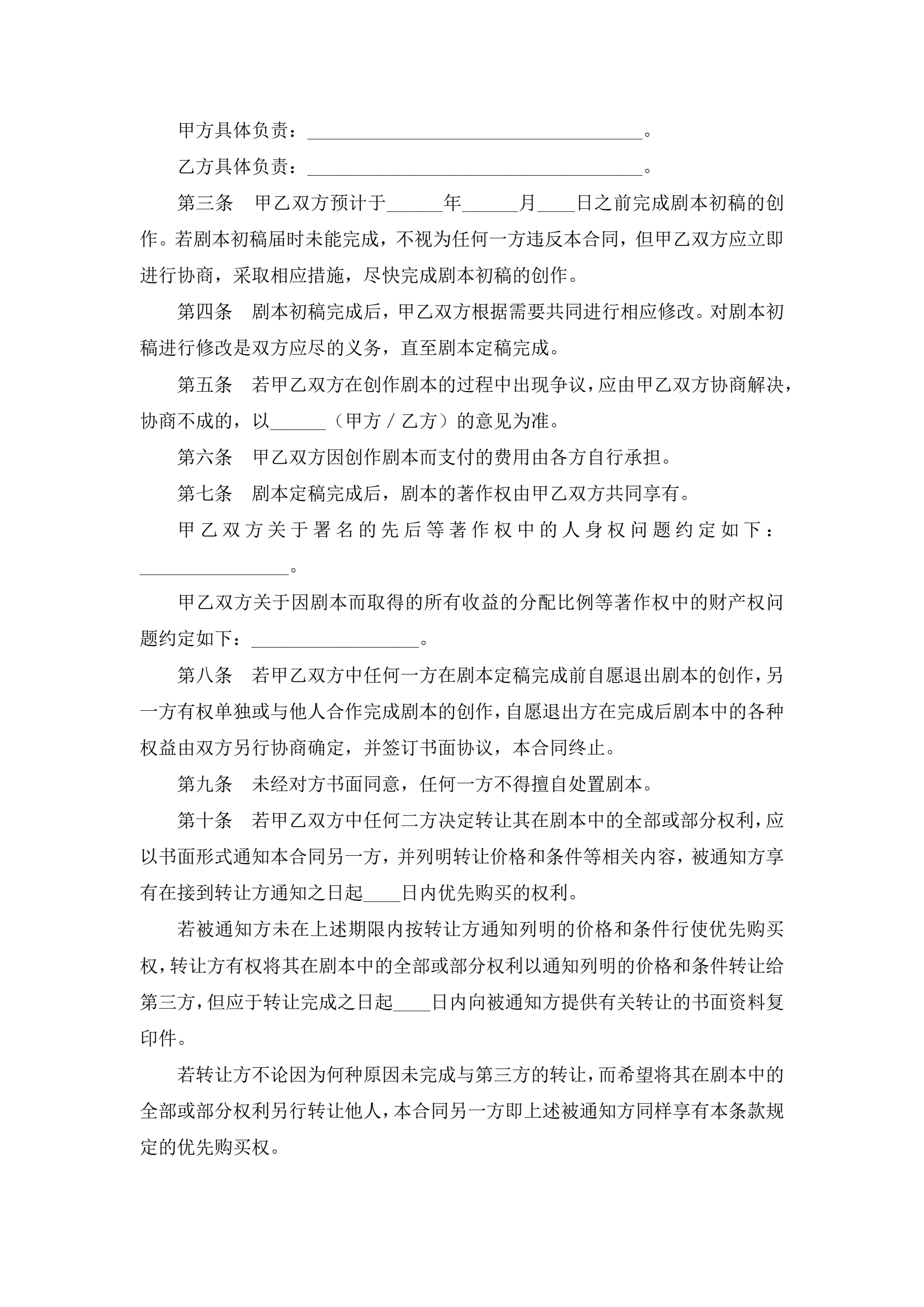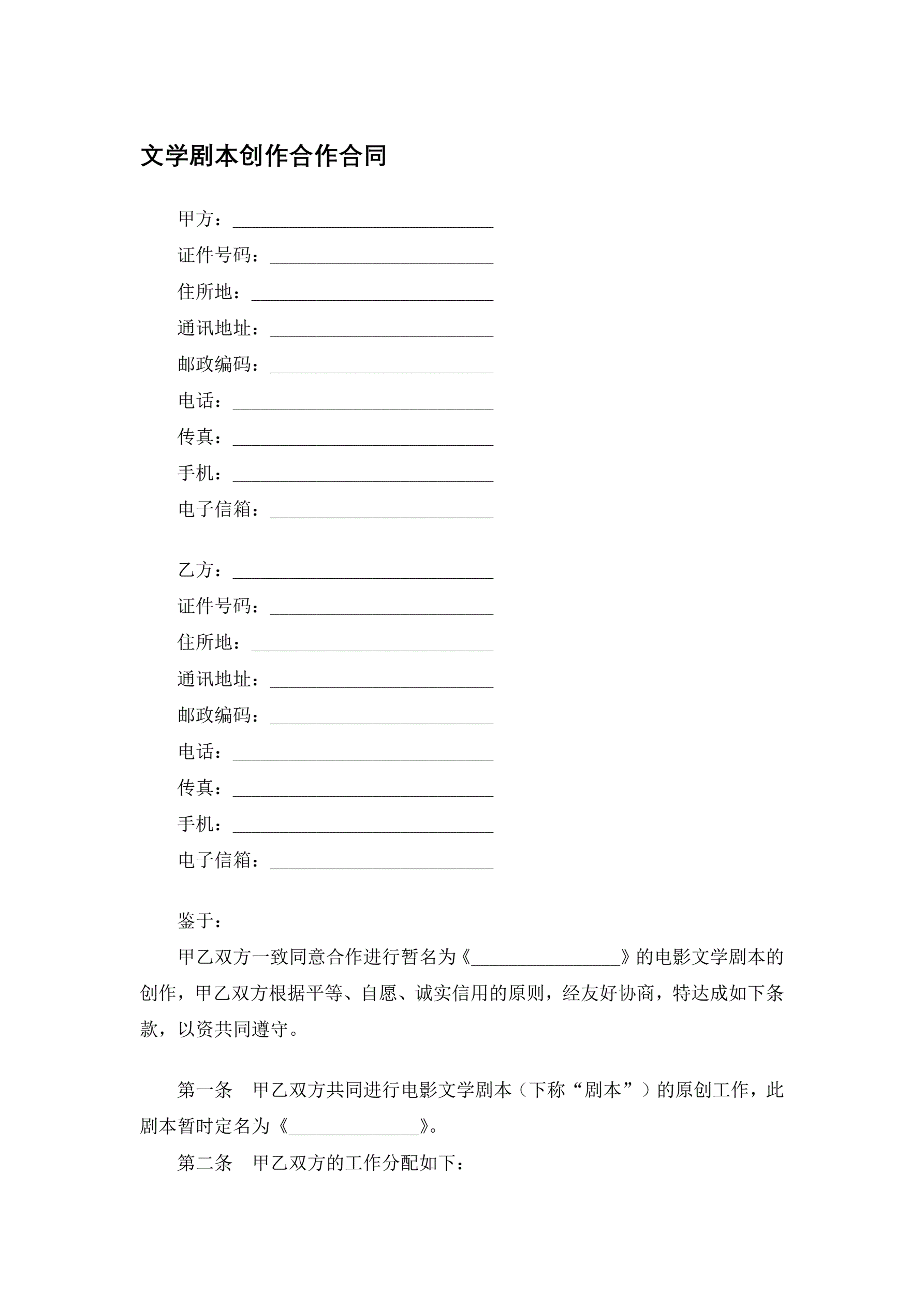 >文学剧本创作合作合同