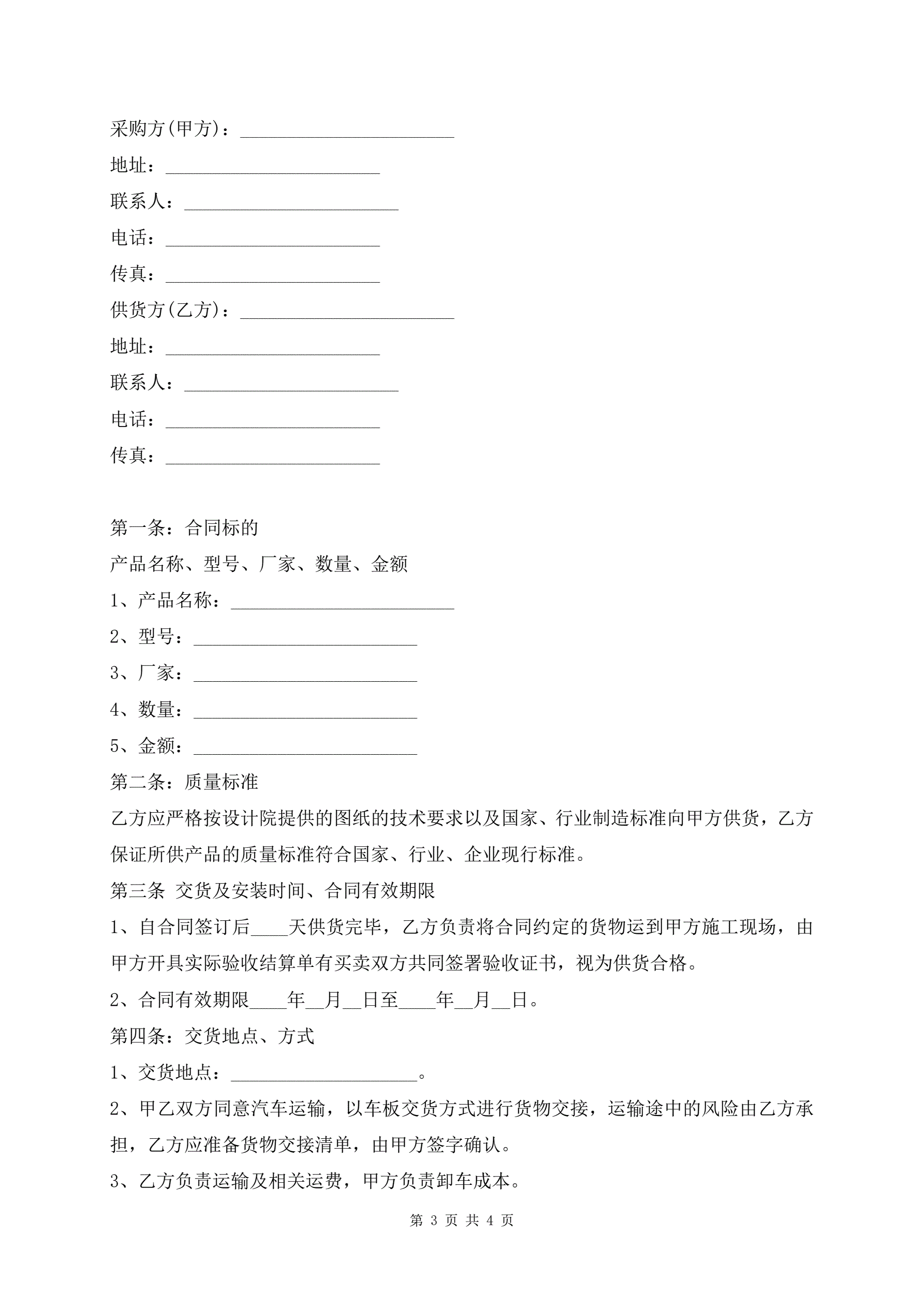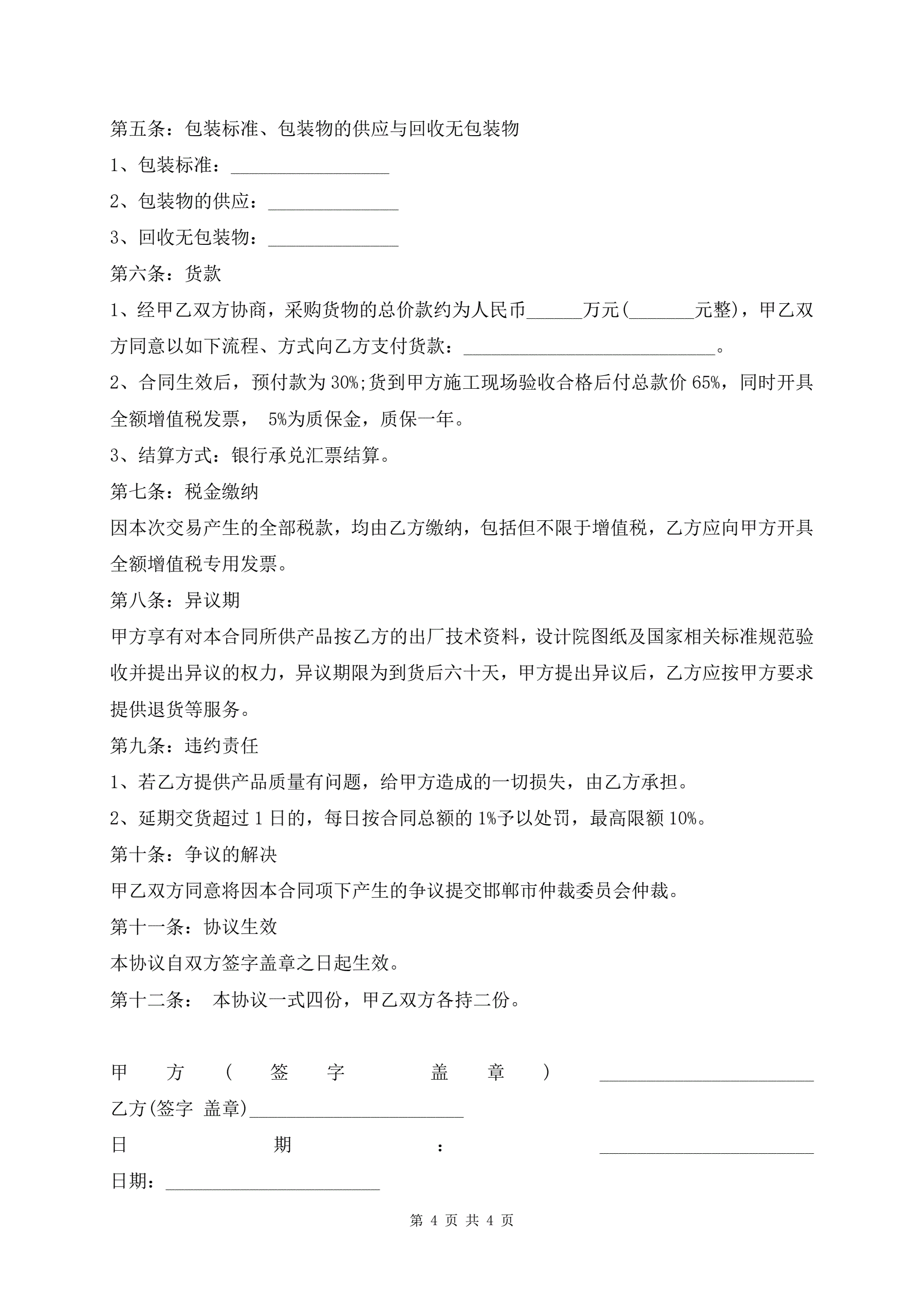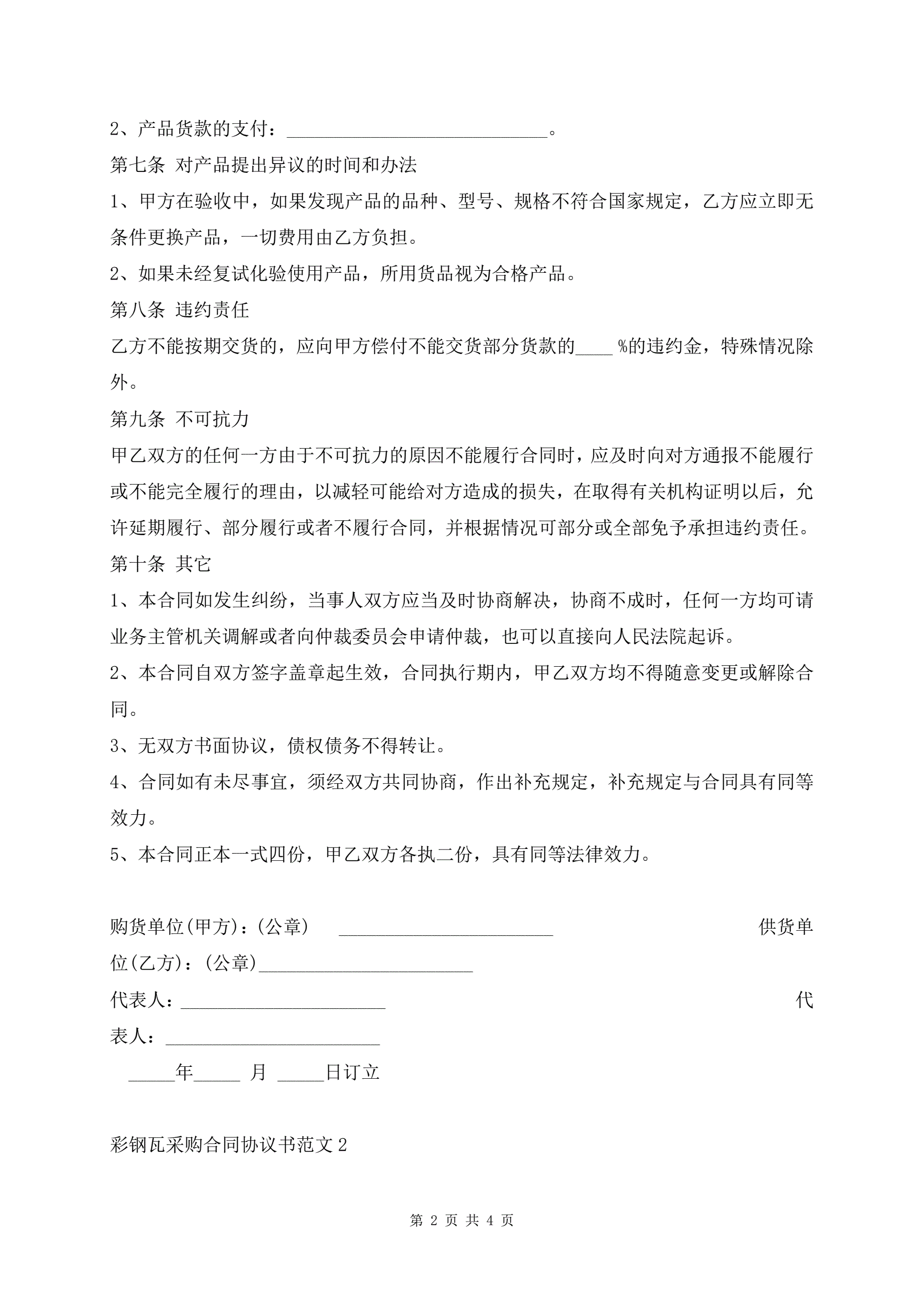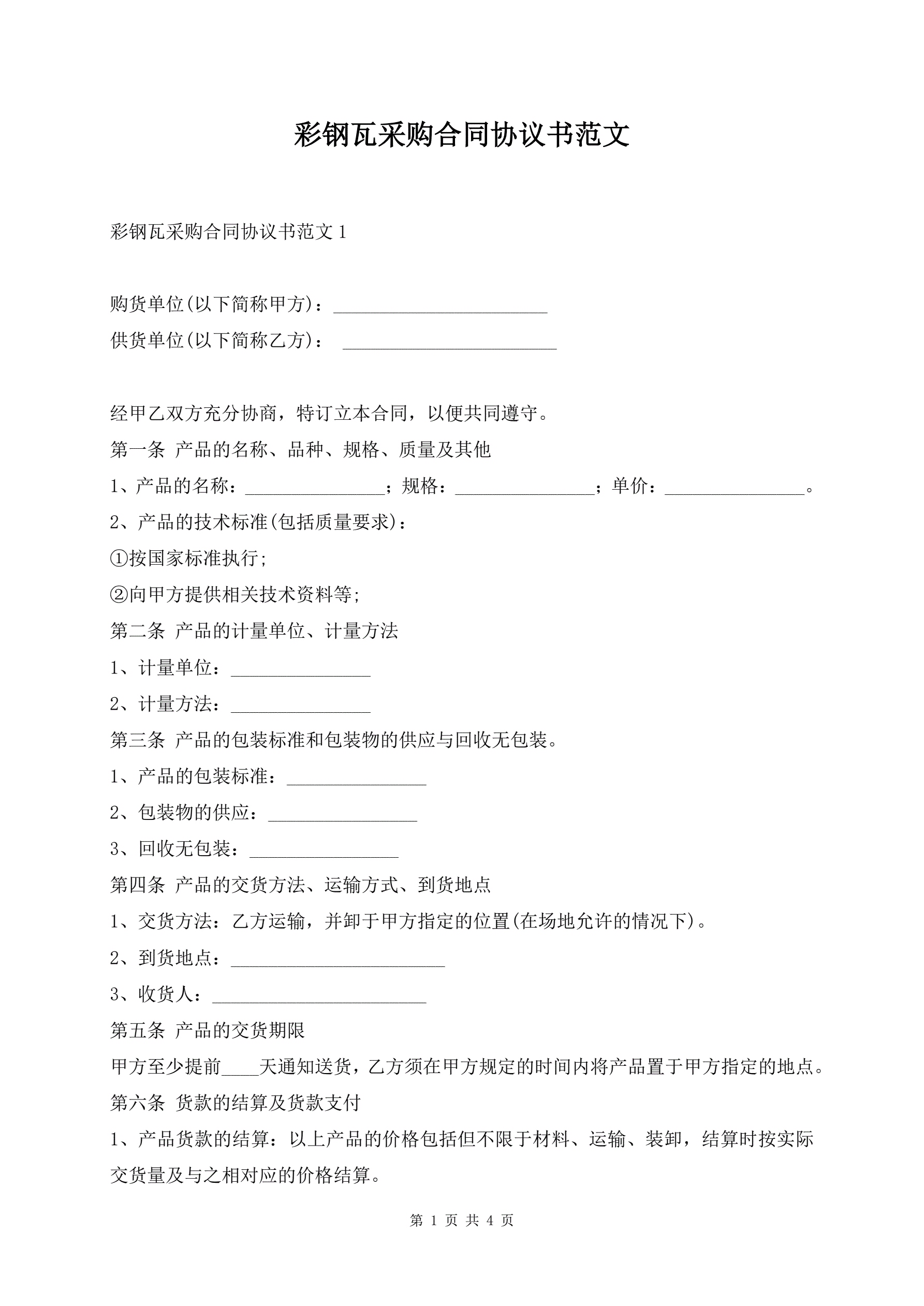 >彩钢瓦采购合同协议书范文