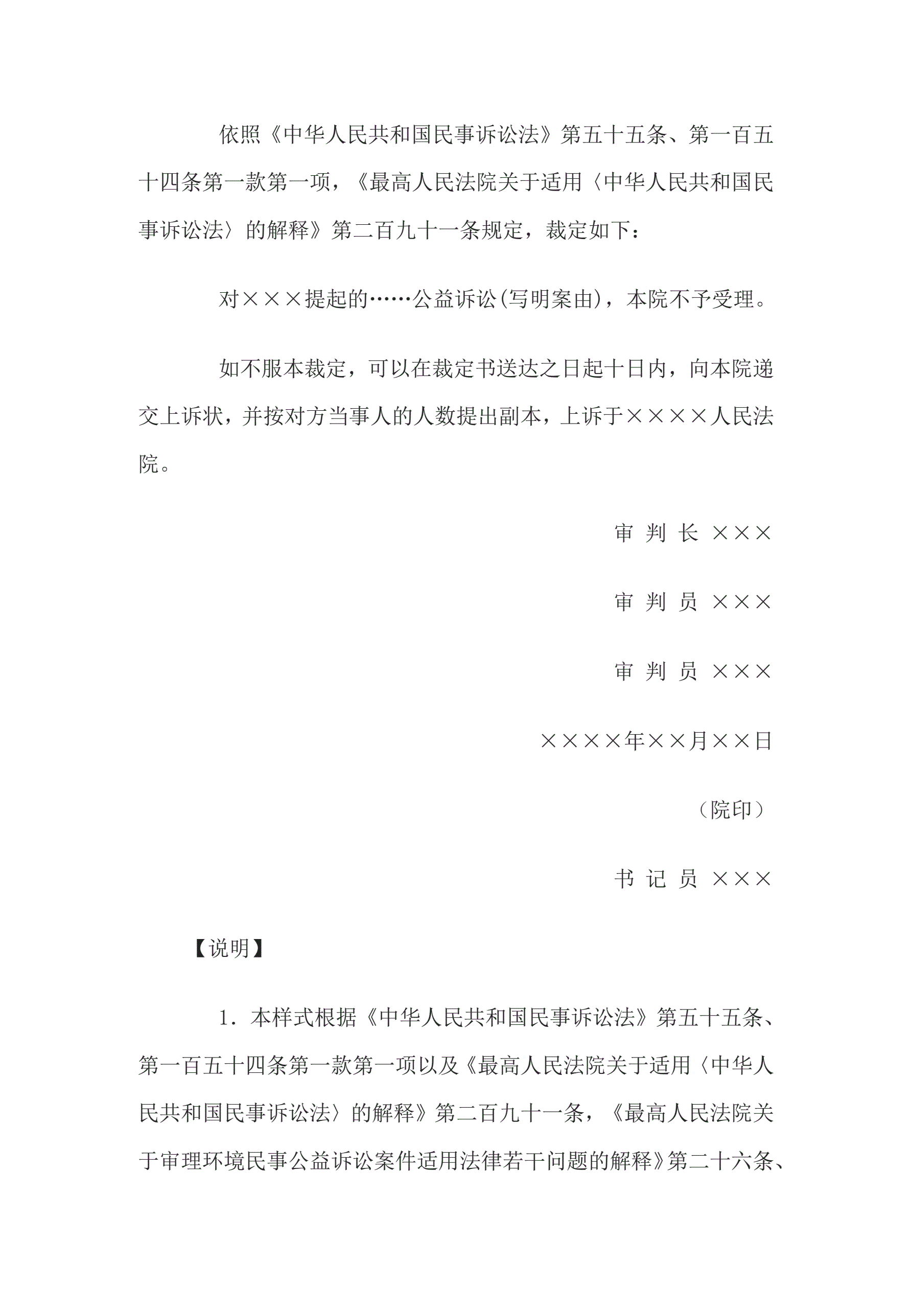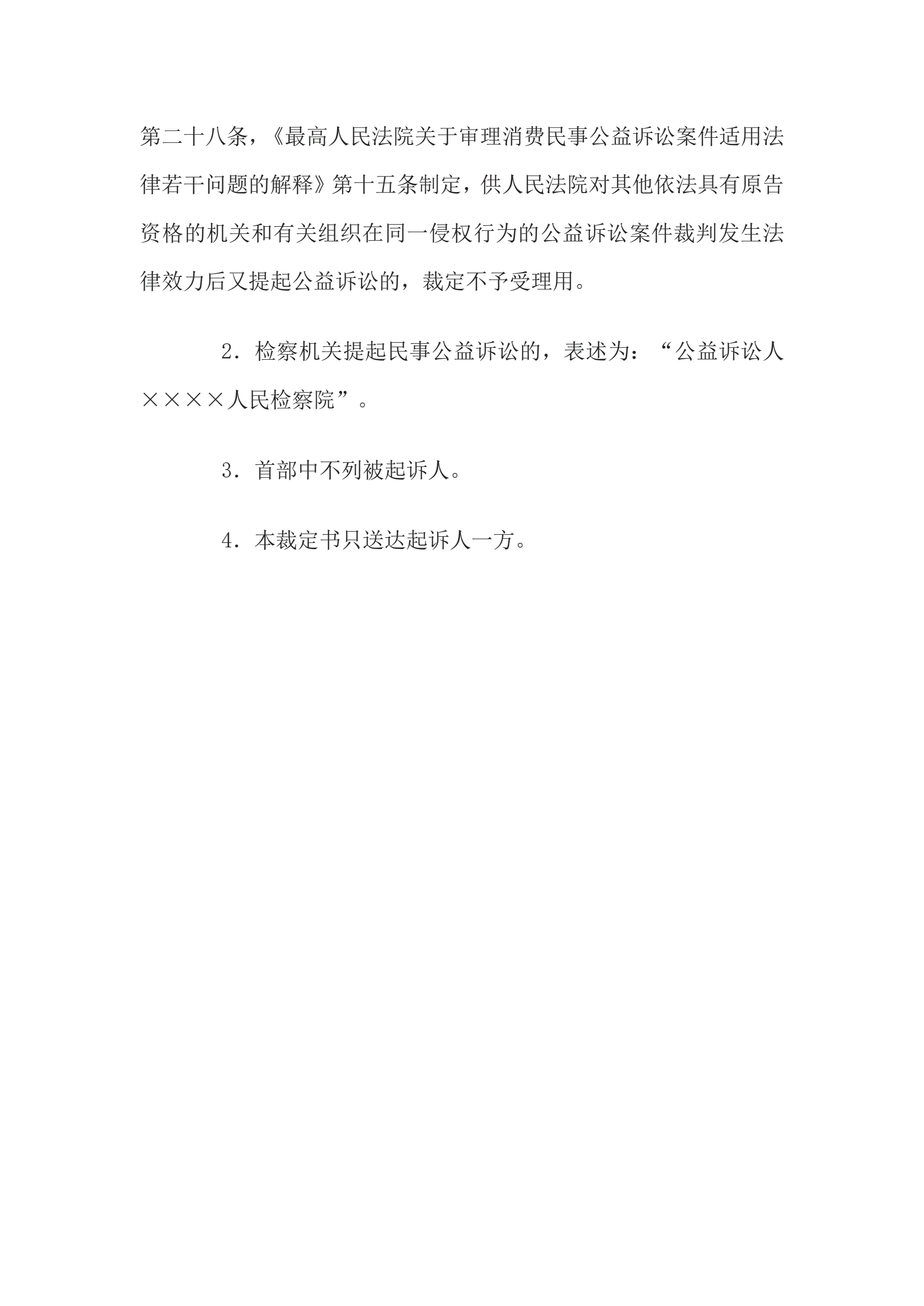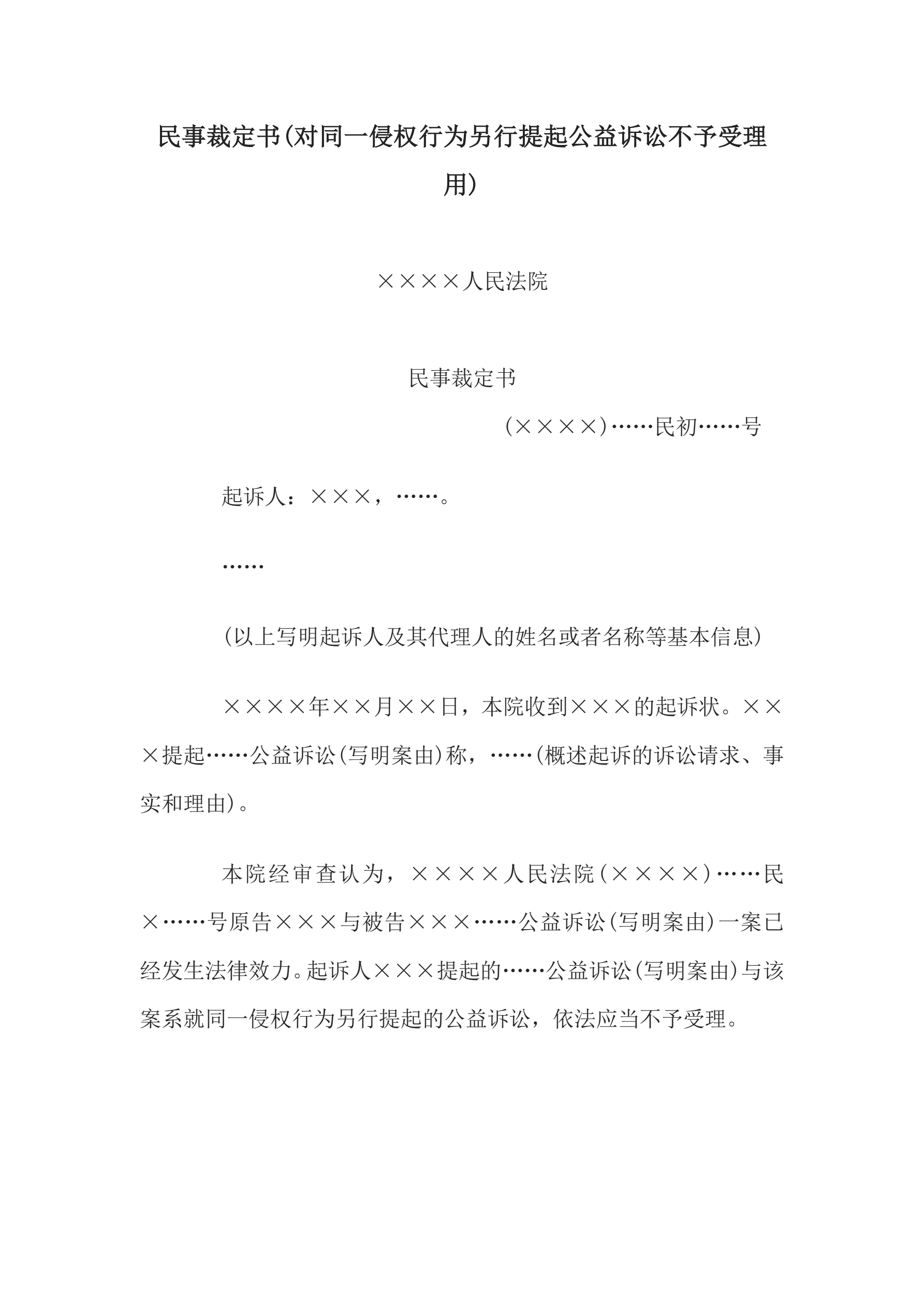 >民事裁定书(对同一侵权行为另行提起公益诉讼不予受理用)