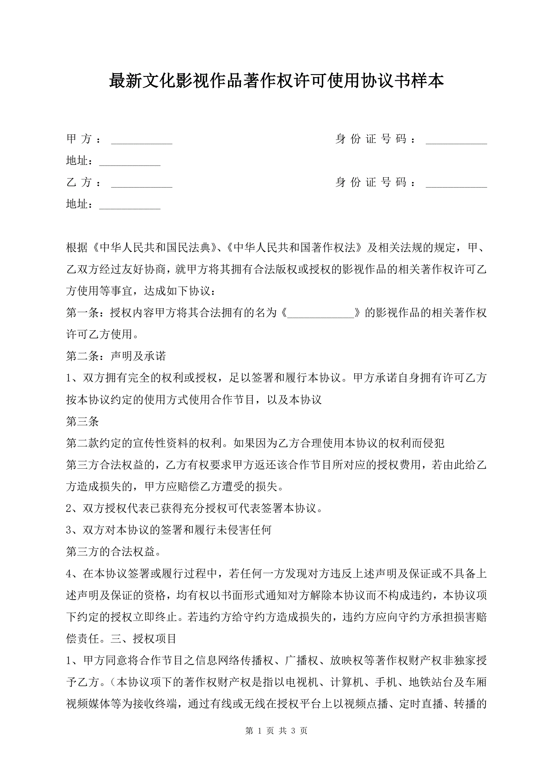 >最新文化影视作品著作权许可使用协议书样本