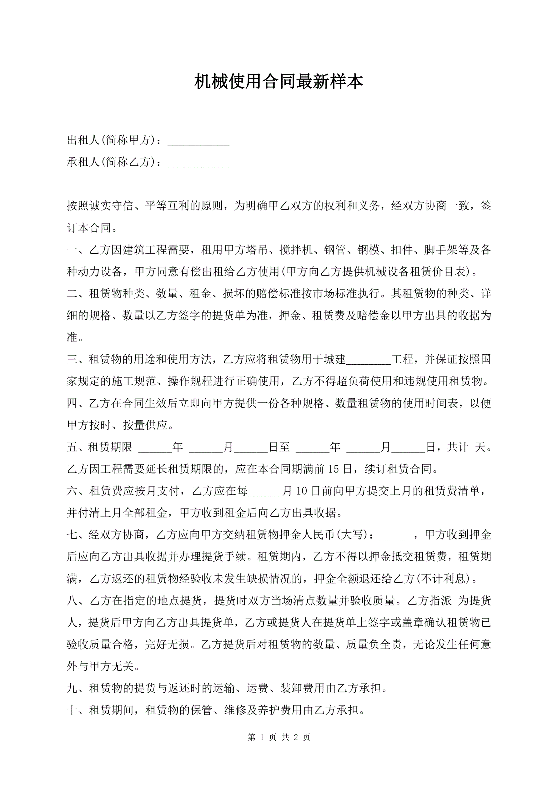 >机械使用合同最新样本