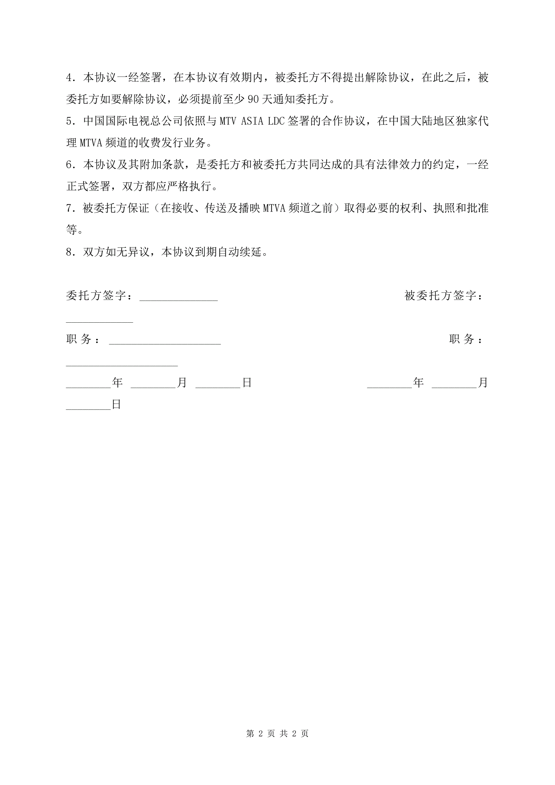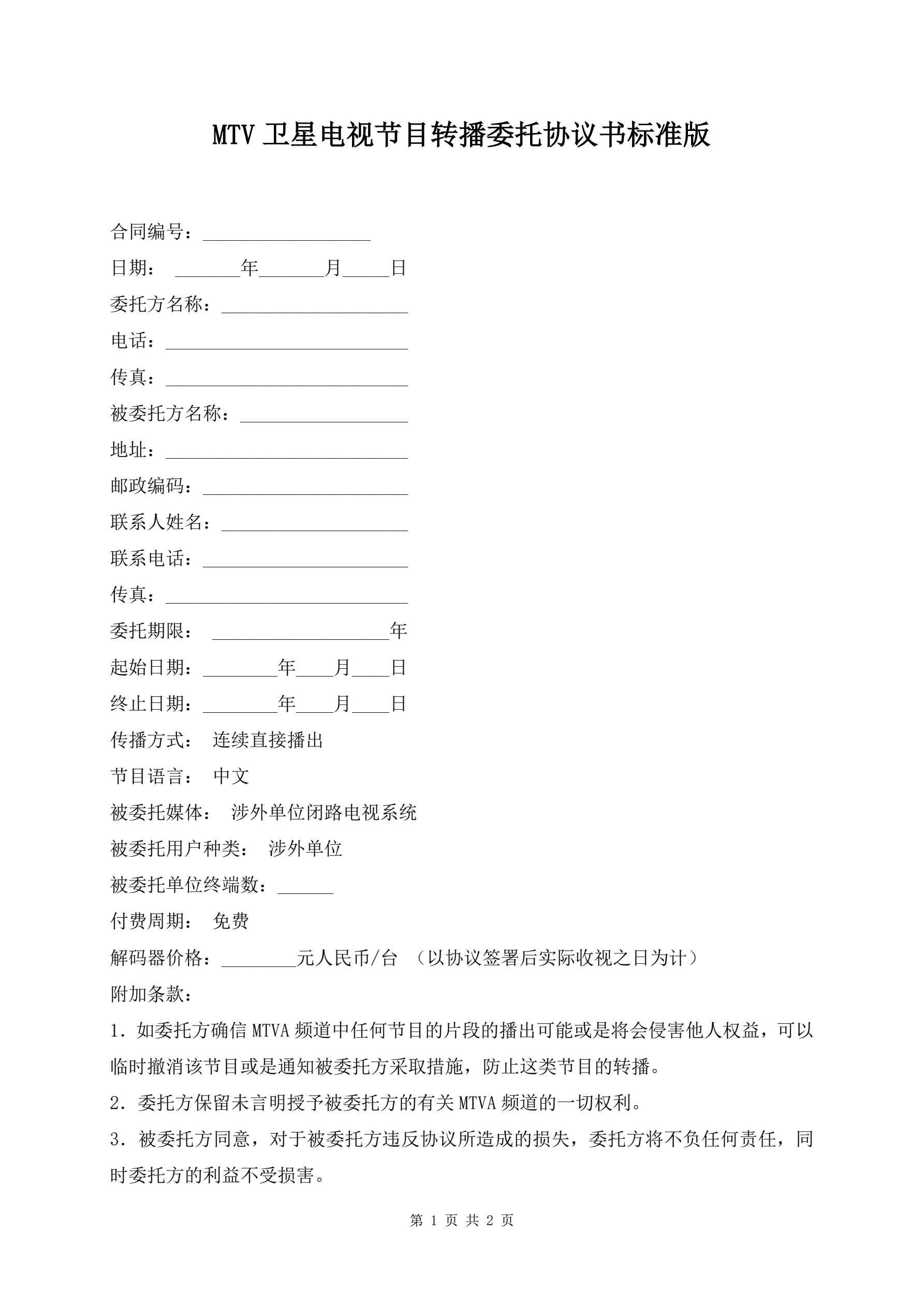 MTV卫星电视节目转播委托协议书标准版