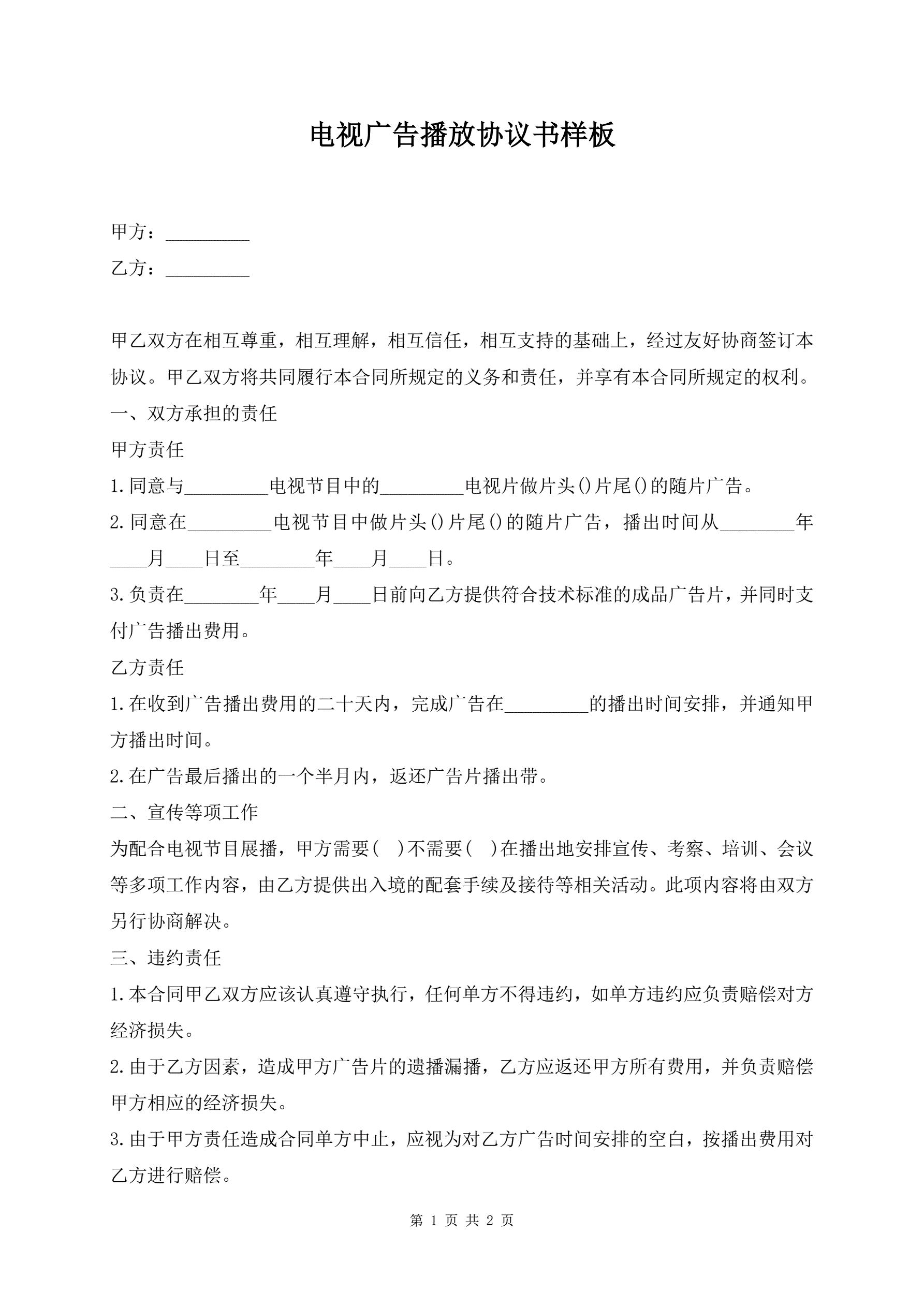 电视广告播放协议书样板