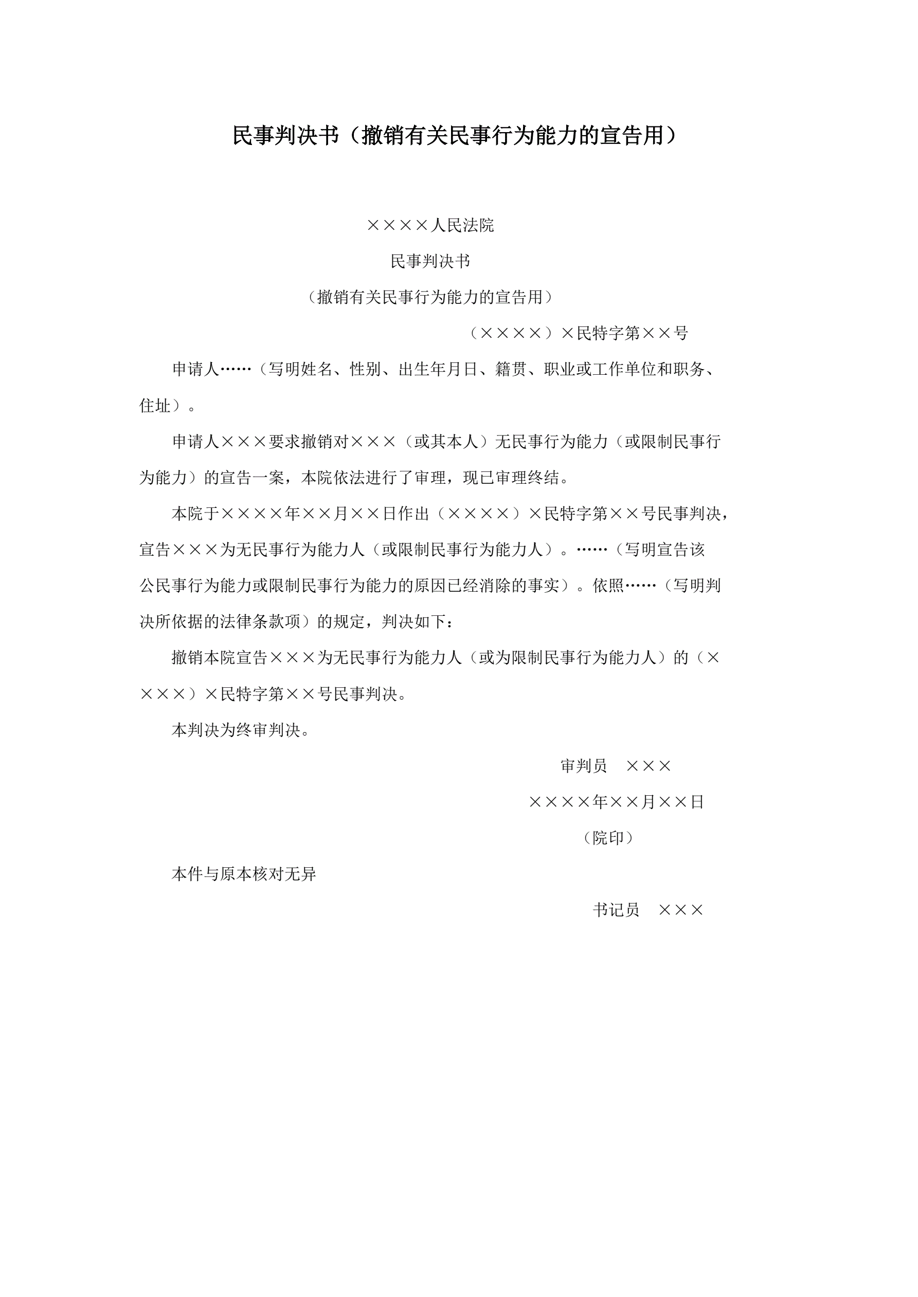 >民事判决书(撤销有关民事行为能力的宣告用)