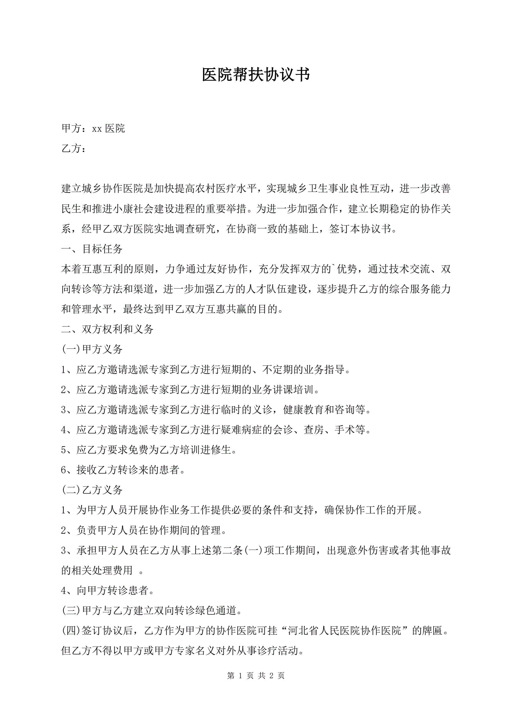 医院帮扶协议书