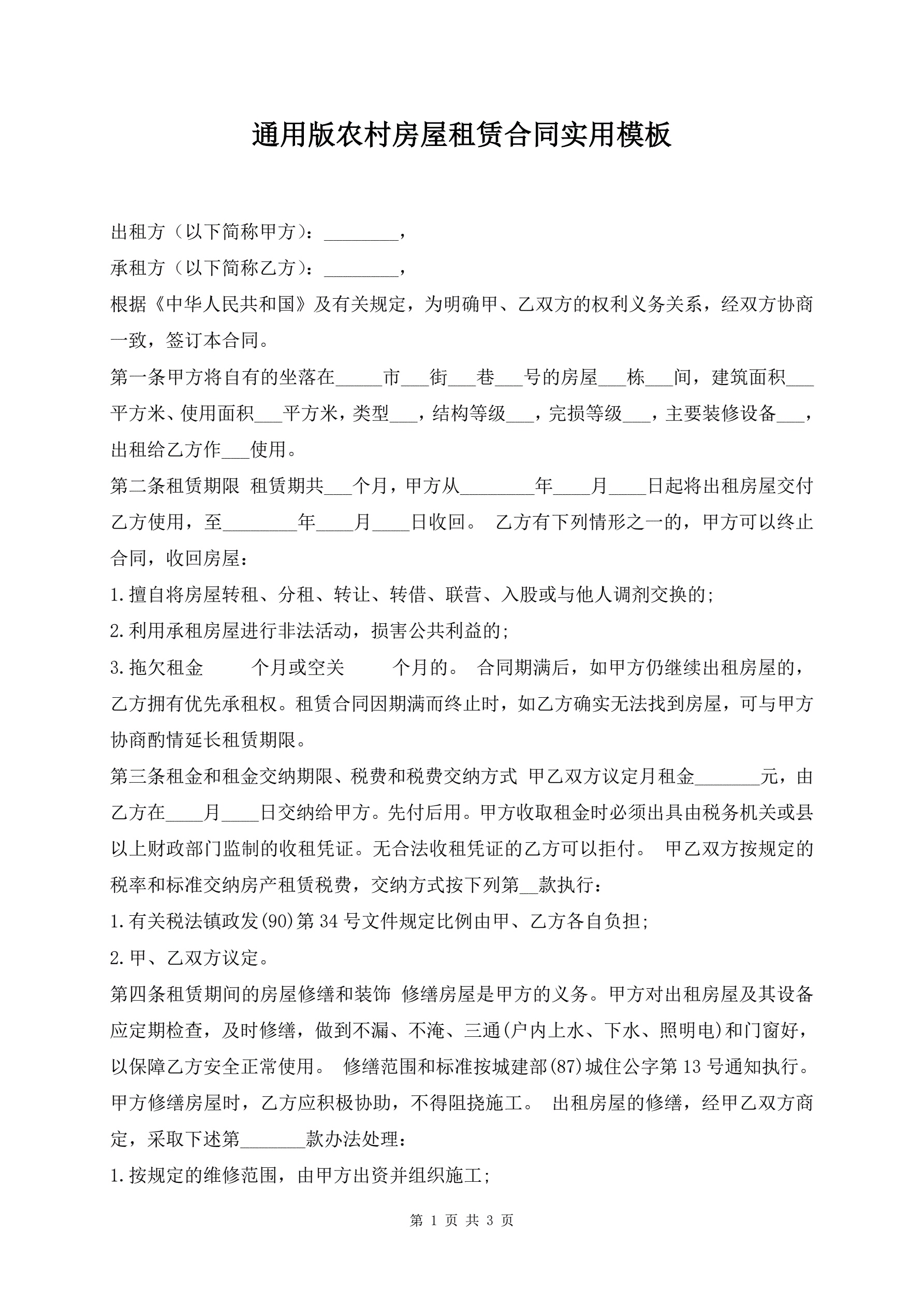 通用版农村房屋租赁合同实用模板