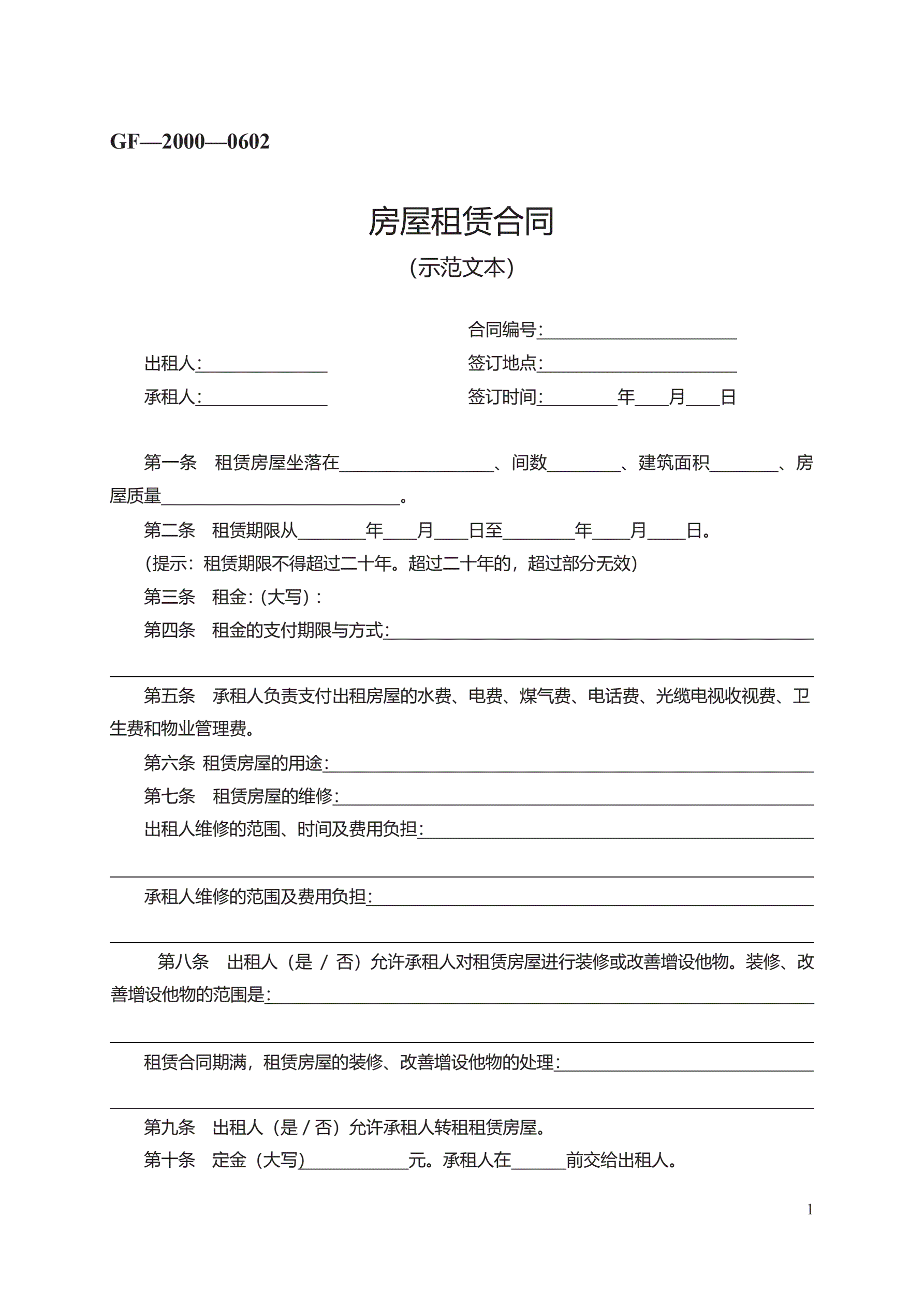 >房屋租赁合同 GF—2000—0602