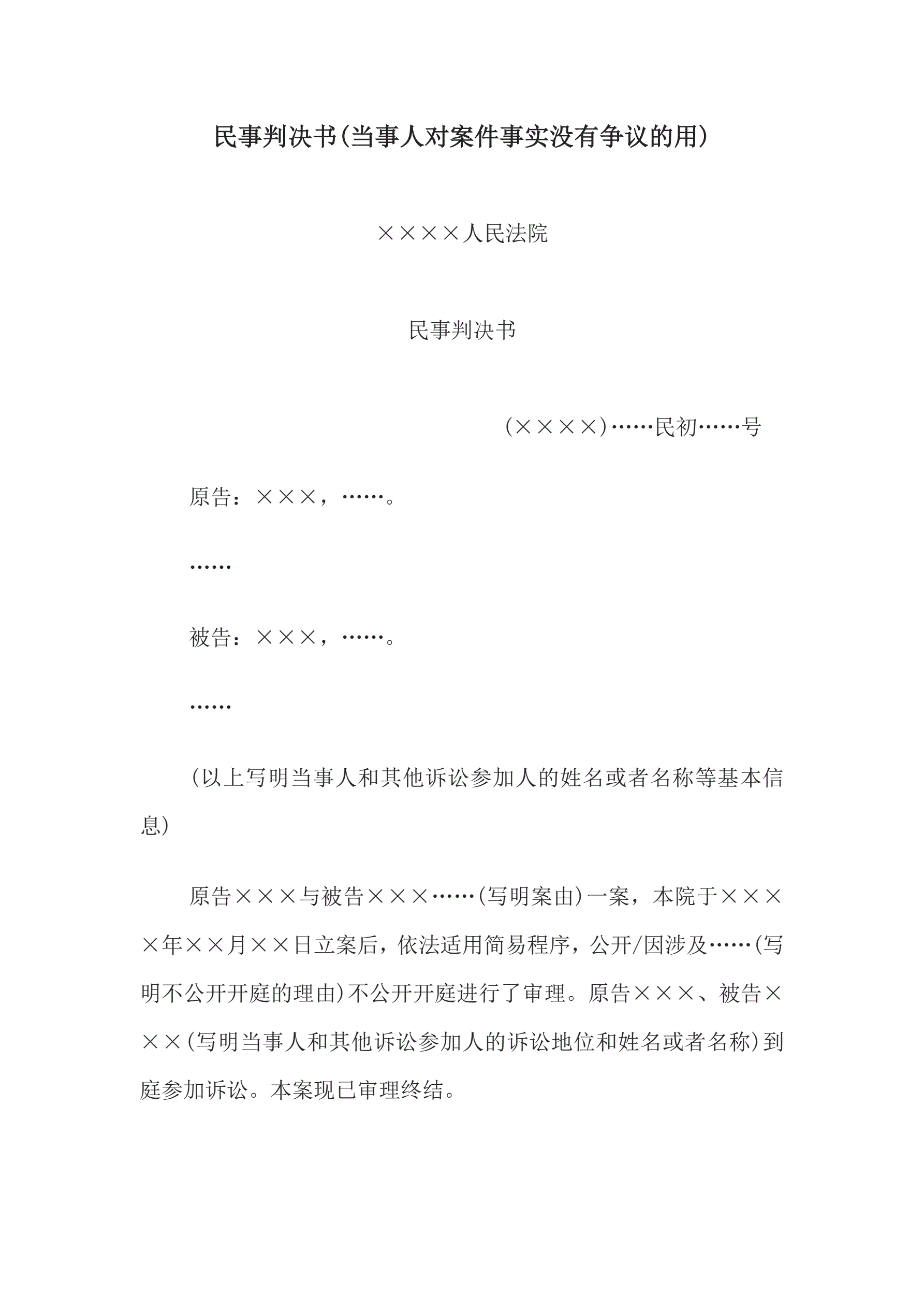 民事判决书(当事人对案件事实没有争议的用)