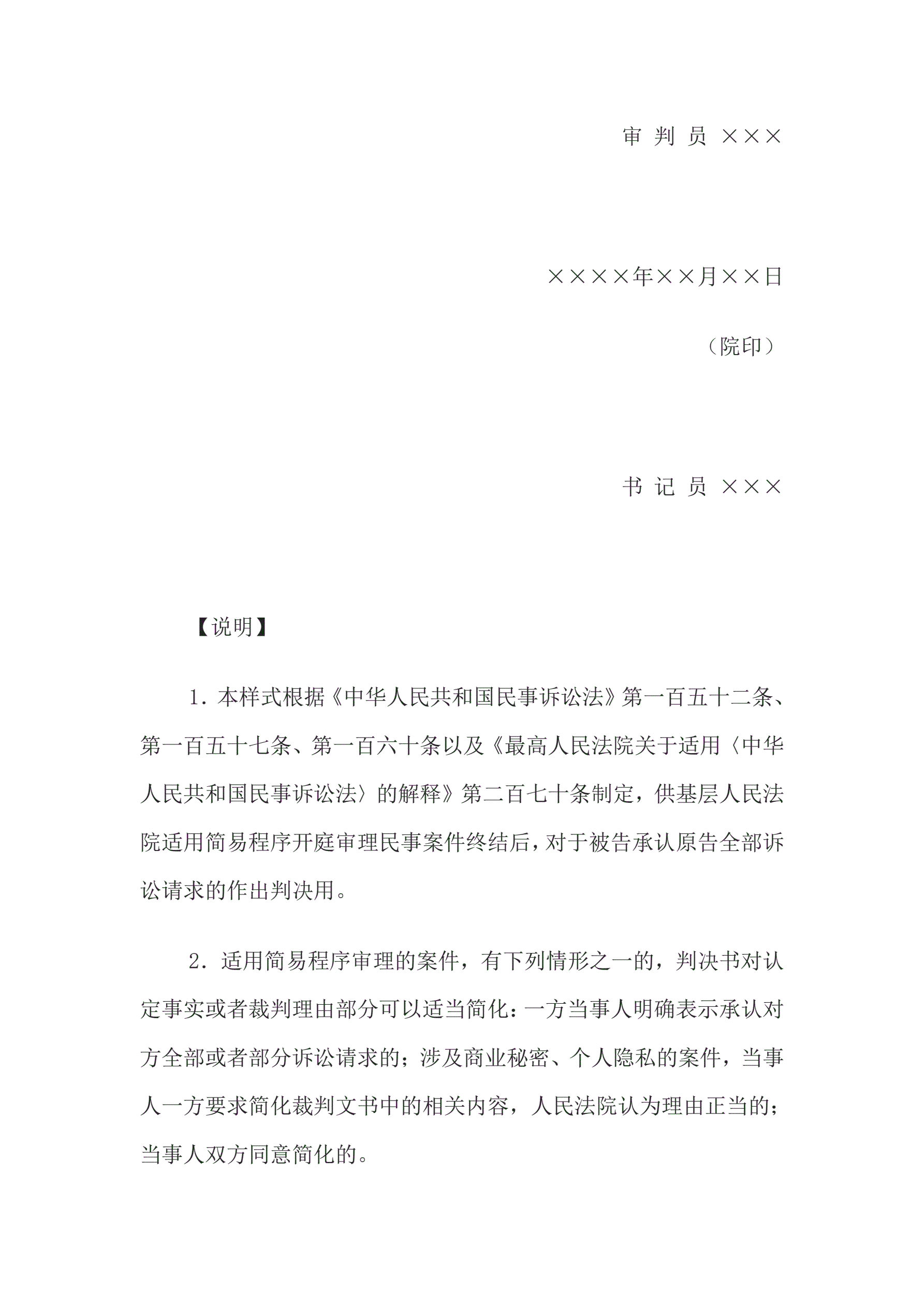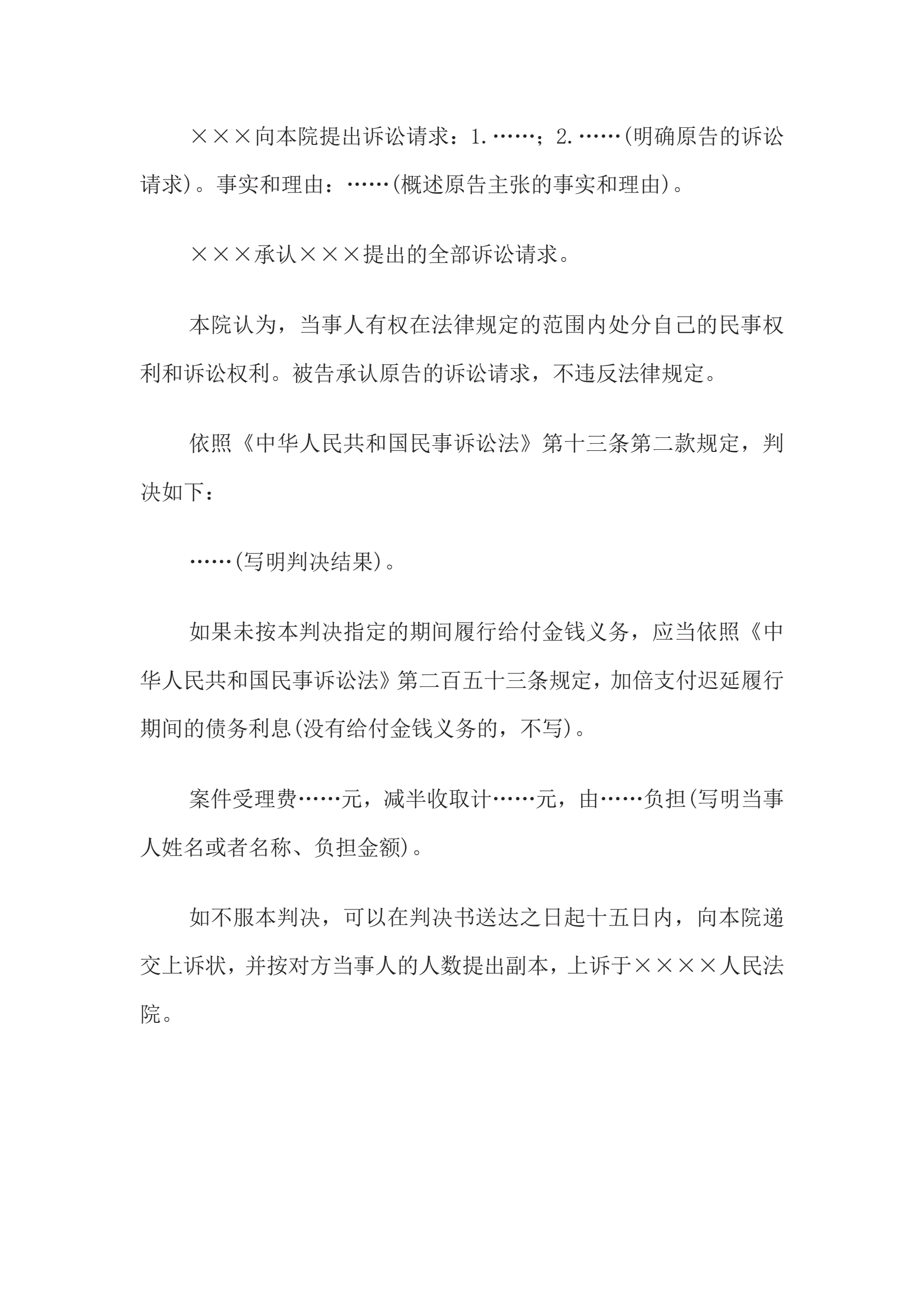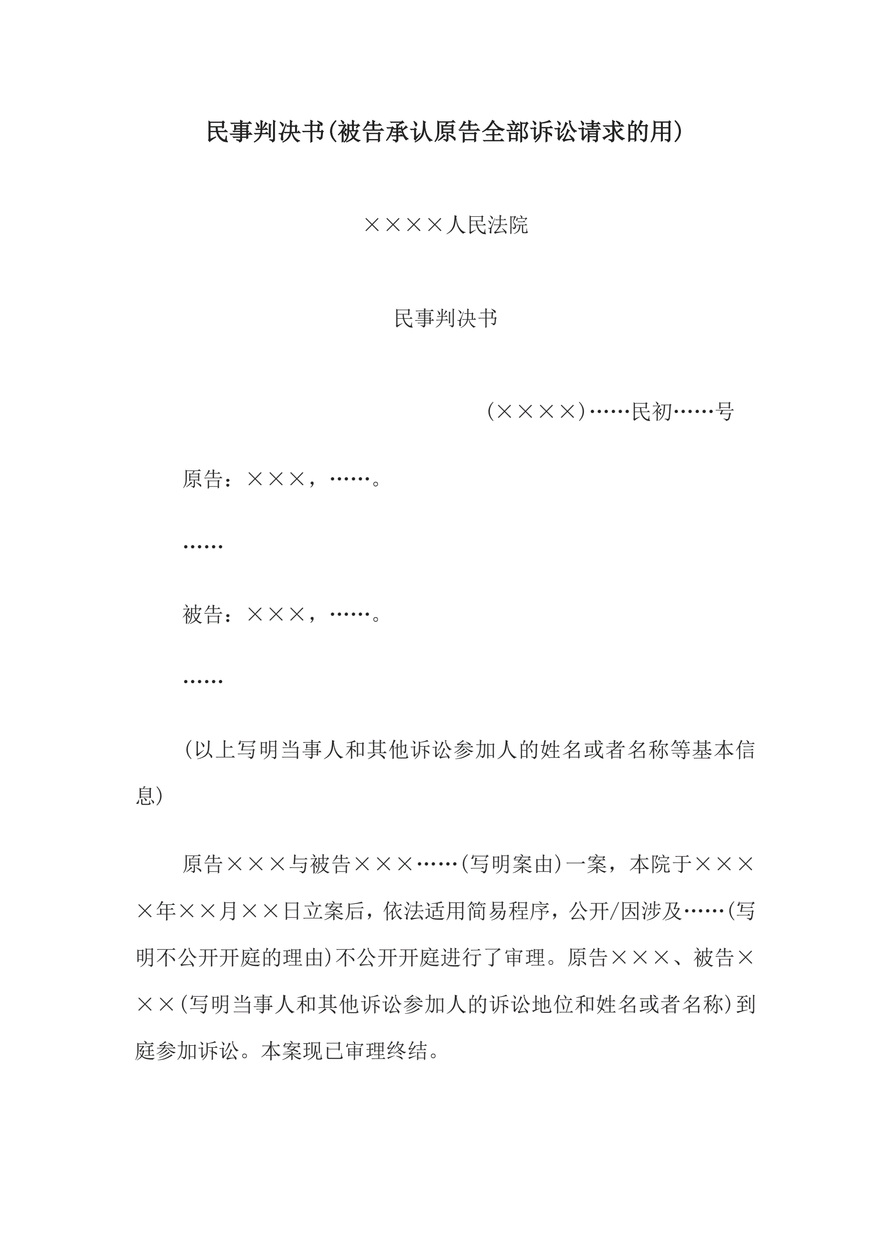 >民事判决书(被告承认原告全部诉讼请求的用)