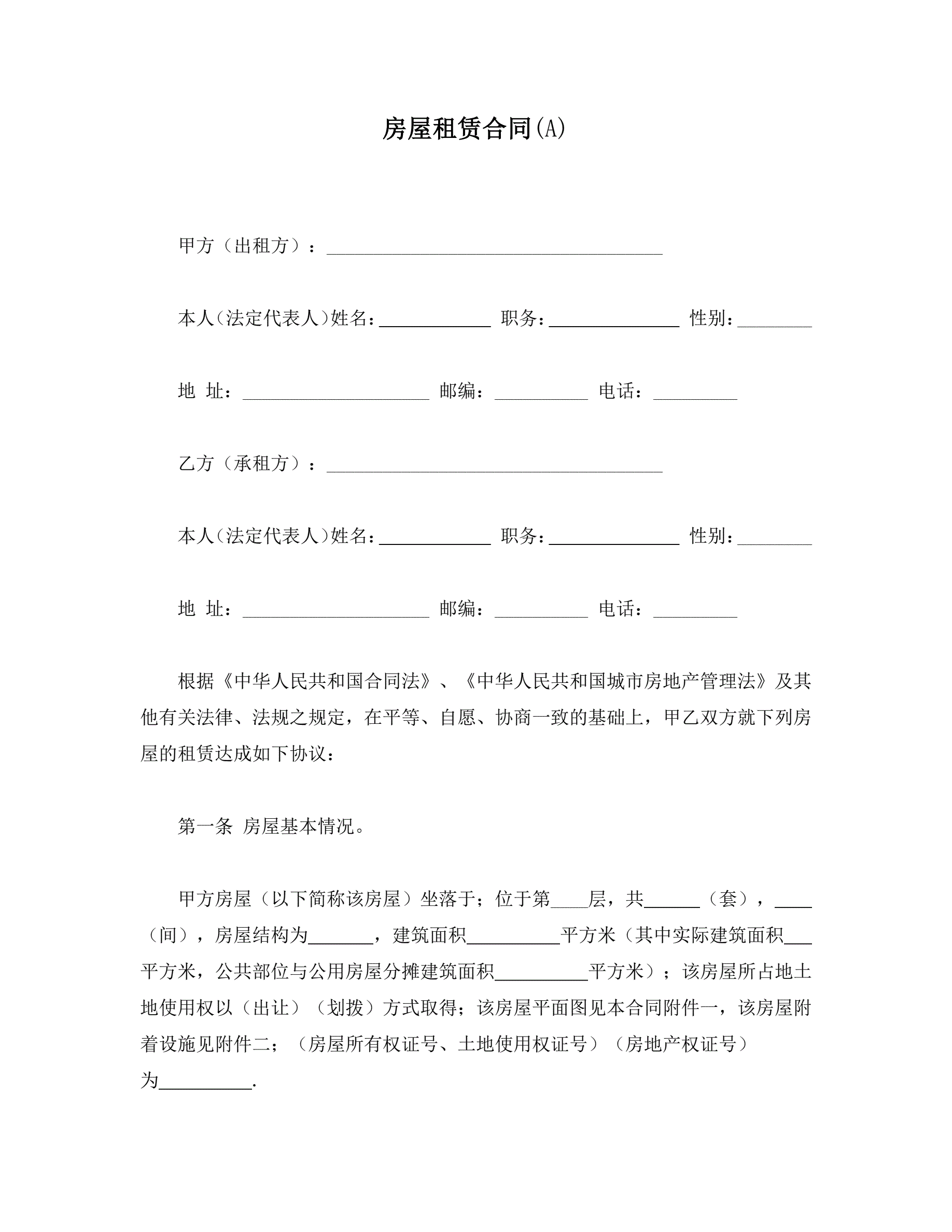 >房屋租赁合同(A)
