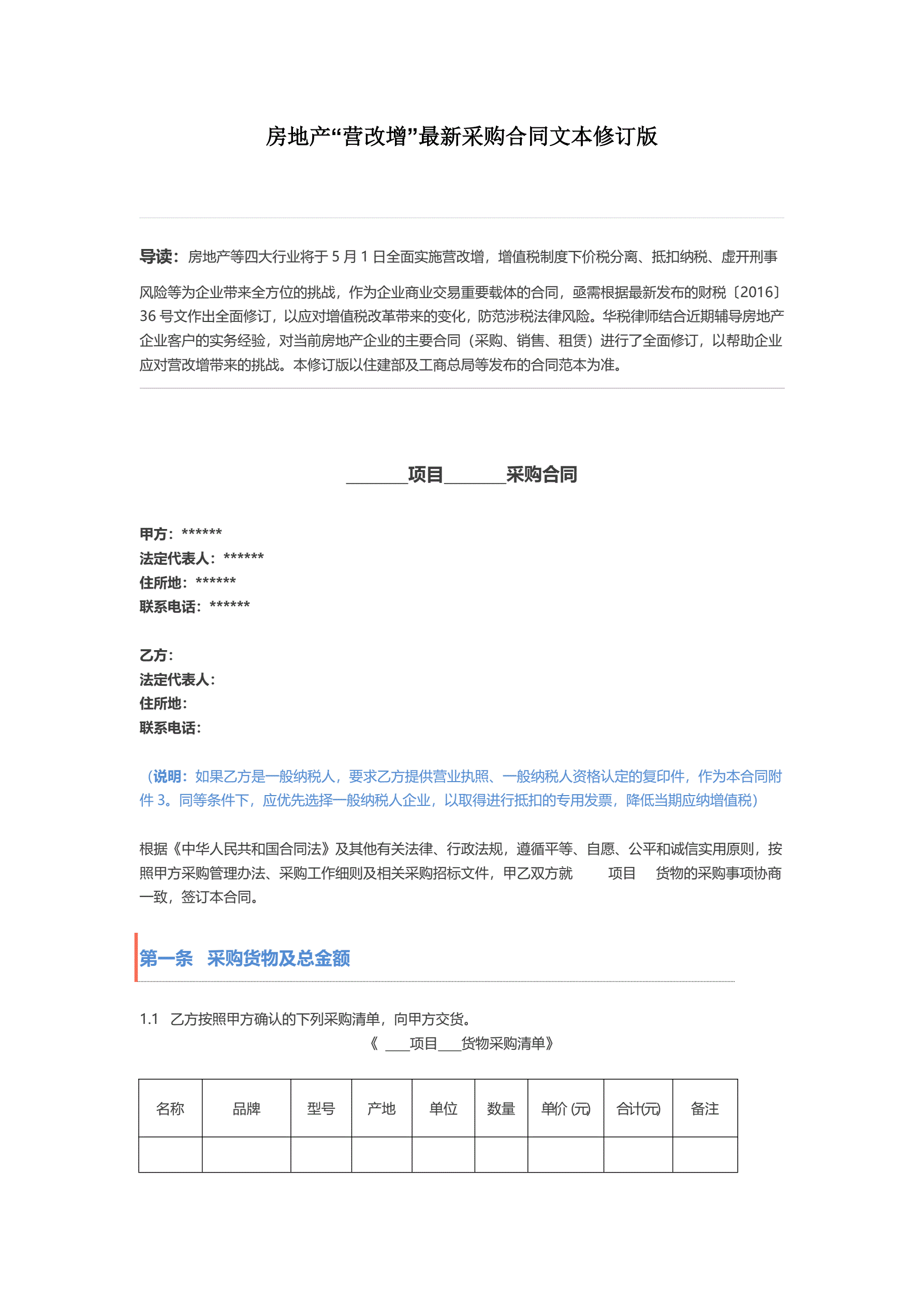 >房地产“营改增”最新采购合同文本修订版